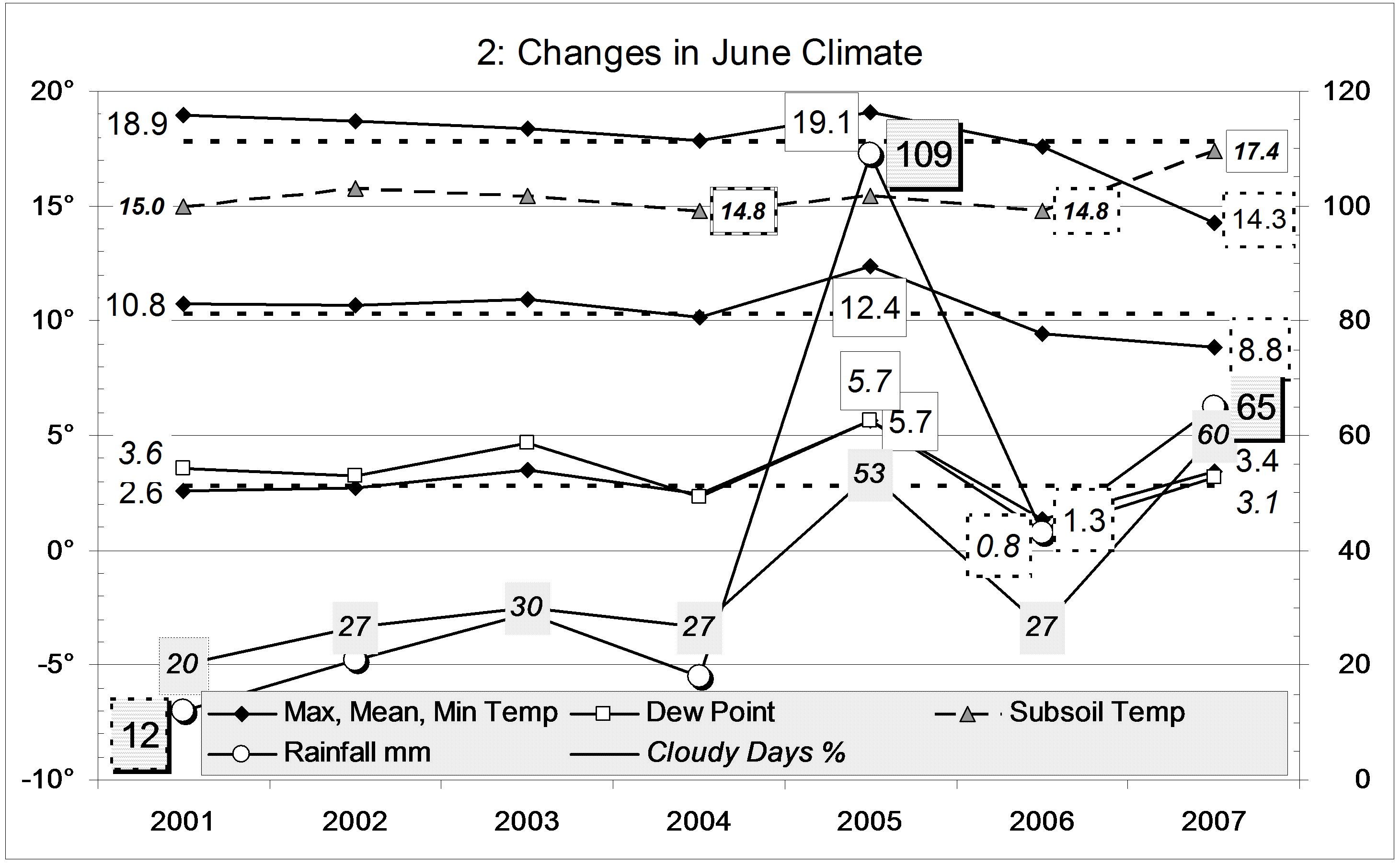 07Juneclimate Published August 5, 2014 at 2922 × 1809 in June 2007 had two very cold days « Previous Graphical log of the last seven June months at Manilla, NSW, showing mean values of maximum, minimum and mean temperature, early morning dew point and cloudy days percent, and total monthly rainfall in millimetres.