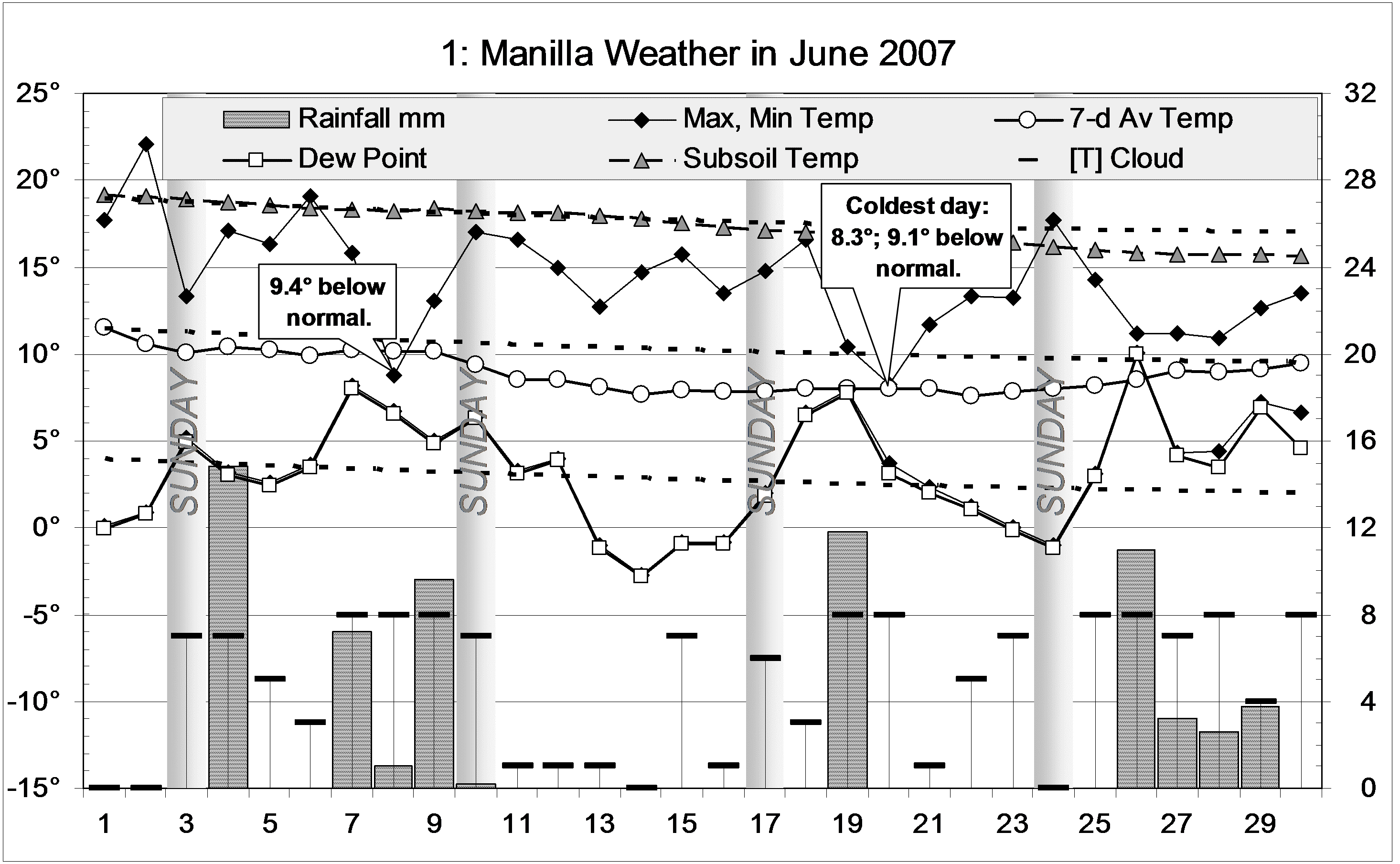 07Juneweather Published August 5, 2014 at 2931 × 1809 in June 2007 had two very cold days Next » Graphical log, for June 2007, of daily values of maximum and minimum temperatures and early morning dew point (all in degrees Celsius), rainfall (mm) and cloud amount (octas). Weekly mean temperature also shown.