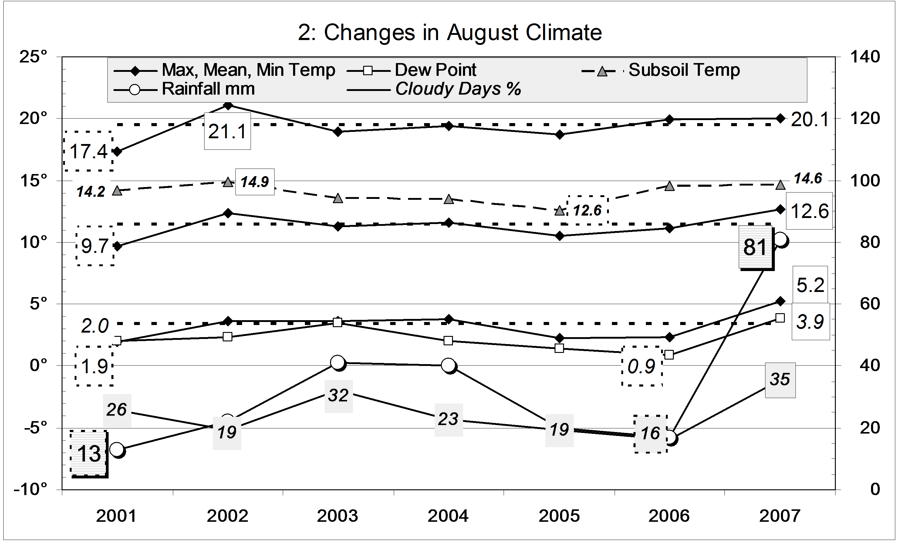 07Augclimate Published August 4, 2014 at 2960 × 1791 in In 2007: Rainy warm August nights « Previous Graphical log of the last seven August months at Manilla, NSW, showing mean values of maximum, minimum and mean temperature, early morning dew point and cloudy days percent, and total monthly rainfall in millimetres.