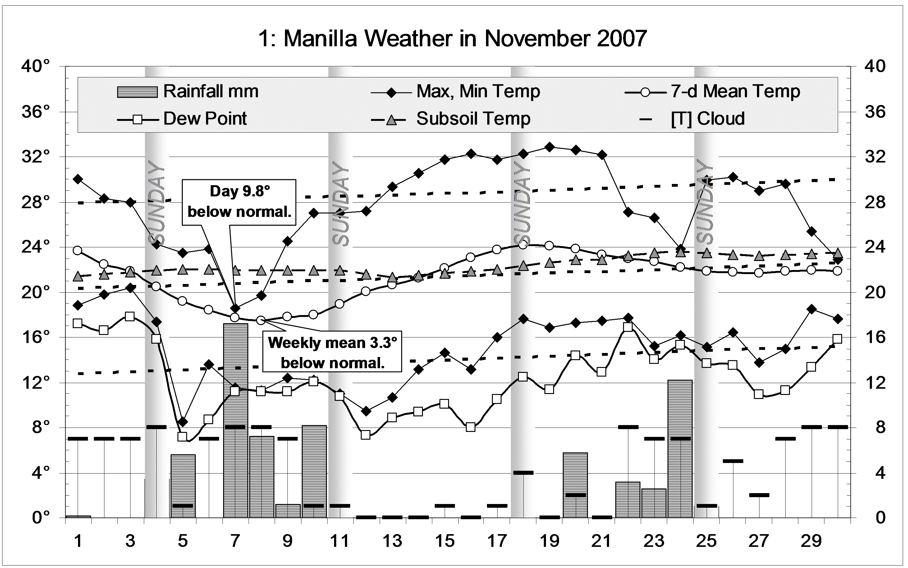 07Novweather Published August 4, 2014 at 2922 × 1828 in Very cloudy November 2007 Next » Graphical log, for November 2007, of daily values of maximum and minimum temperatures and early morning dew point (all in degrees Celsius), rainfall (mm) and cloud amount (octas). Weekly mean temperature also shown.