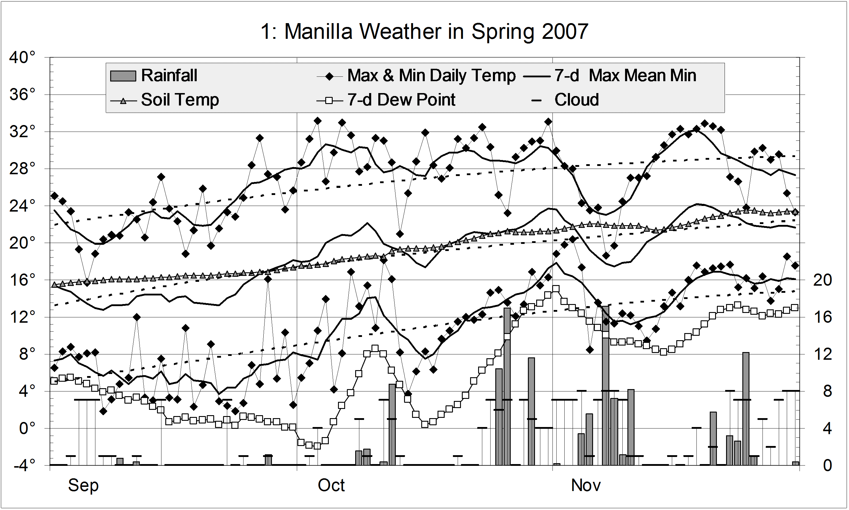 Graphical log, for spring (MAM) of daily values of maximum, minimum and mean temperatures, subsoil (750mm) temperature (all in degrees Celsius), rainfall (mm) and cloud amount (octas). Seven-day mean values of maximum, mean and minimum temperatures and early-morning dew point are also plotted.