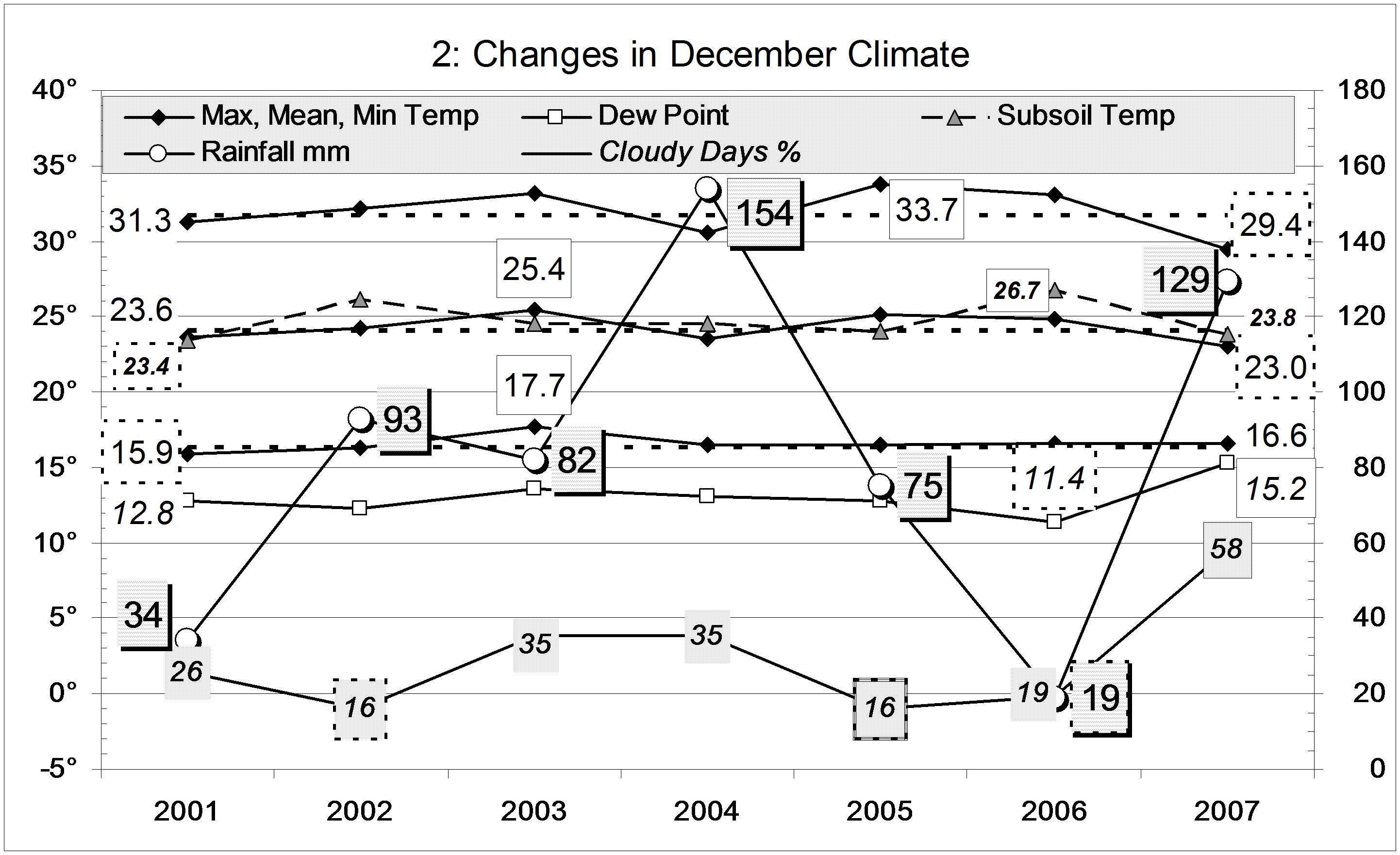 07Decclimate Published August 4, 2014 at 2884 × 1762 in December 2007 cool, humid, cloudy, rainy « Previous Graphical log of the last seven December months at Manilla, NSW, showing mean values of maximum, minimum and mean temperature, early morning dew point and cloudy days percent, and total monthly rainfall in millimetres.