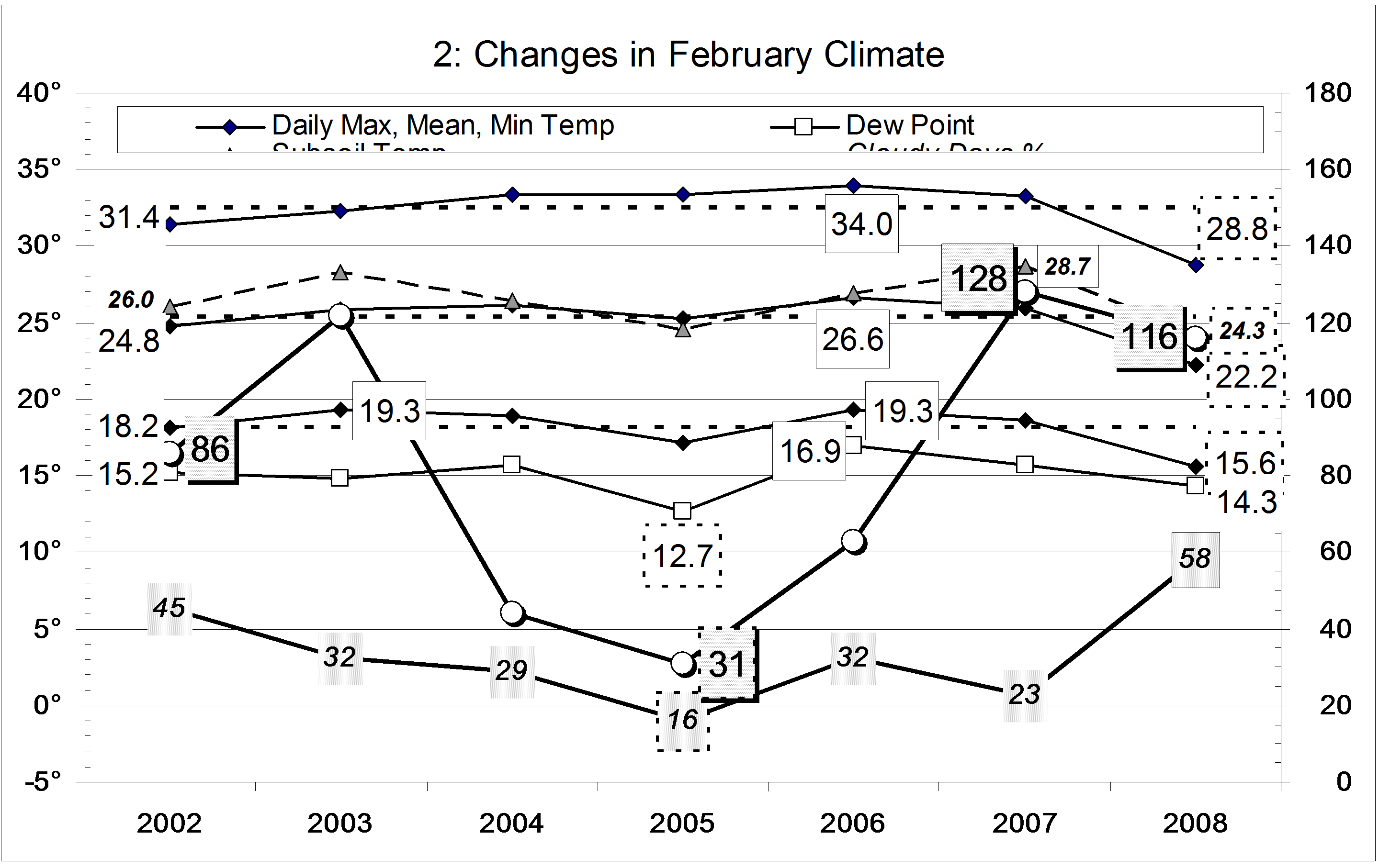 08Februaryclimate Published August 3, 2014 at 2880 × 1814 in Cold, cloudy wet February 2008 « Previous Graphical log of the last seven February months at Manilla, NSW, showing mean values of maximum, minimum and mean temperature, early morning dew point and cloudy days percent, and total monthly rainfall in millimetres.