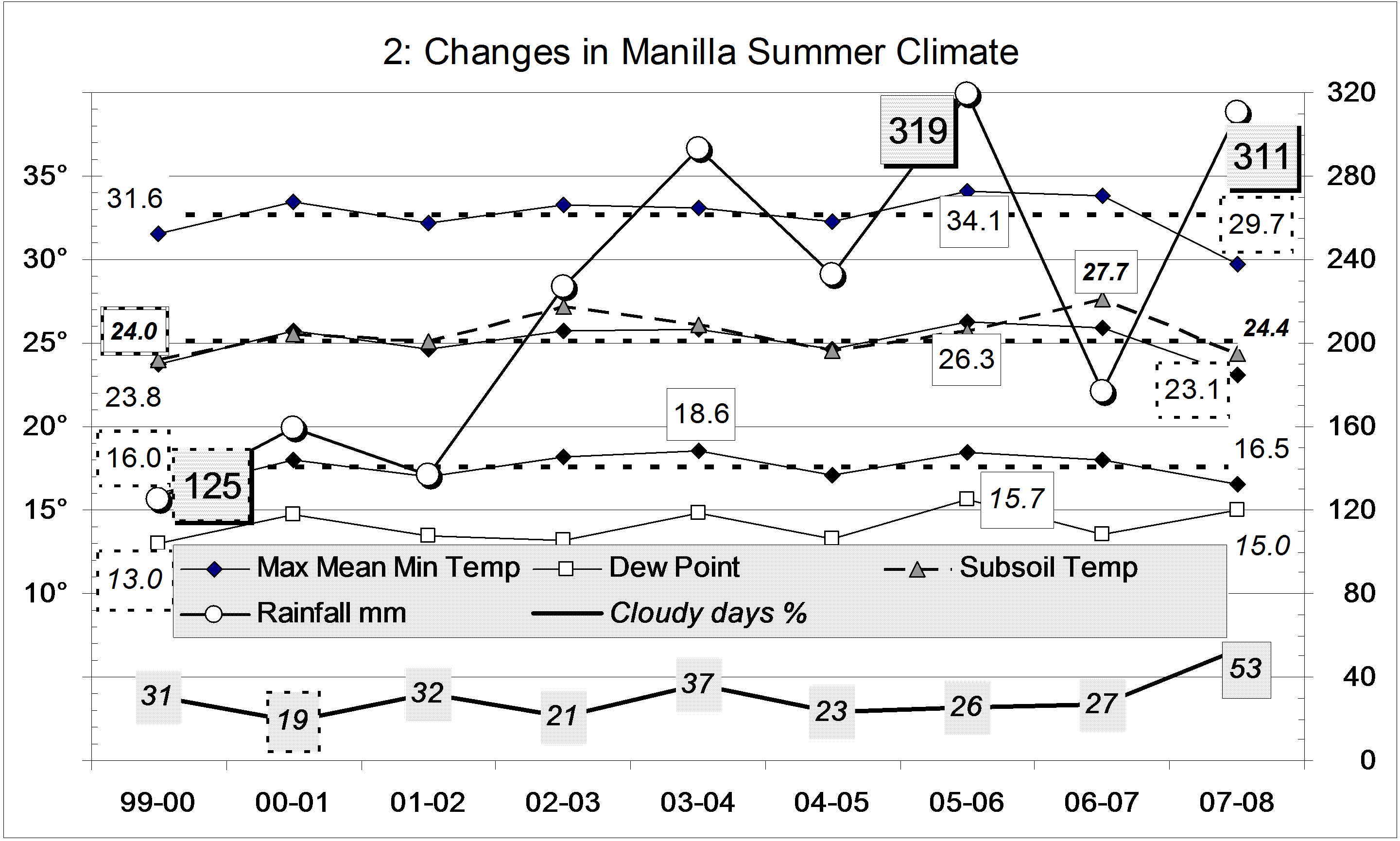 0708summerclimate Published October 9, 2014 at 2881 × 1731 in Summer 2007-08 was very cool,cloudy and wet « Previous Graphical log of the last nine summer seasons (DJF) at Manilla, NSW, showing mean values of maximum, minimum and mean temperature, soil temperature, early morning dew point and cloudy days percent, and total seasonal rainfall in millimetres.