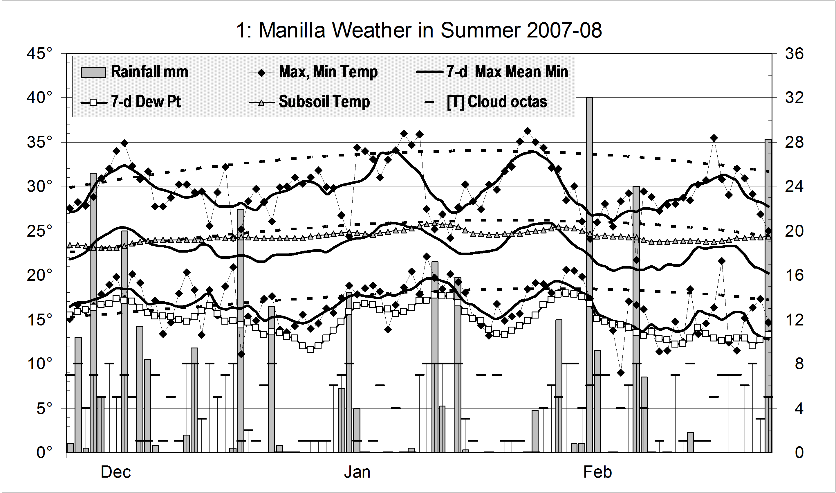 Graphical log, for summer (DJF) of daily values of maximum, minimum and mean temperatures, subsoil (750mm) temperature (all in degrees Celsius), rainfall (mm) and cloud amount (octas). Seven-day mean values of maximum, mean and minimum temperatures and early-morning dew point are also plotted.