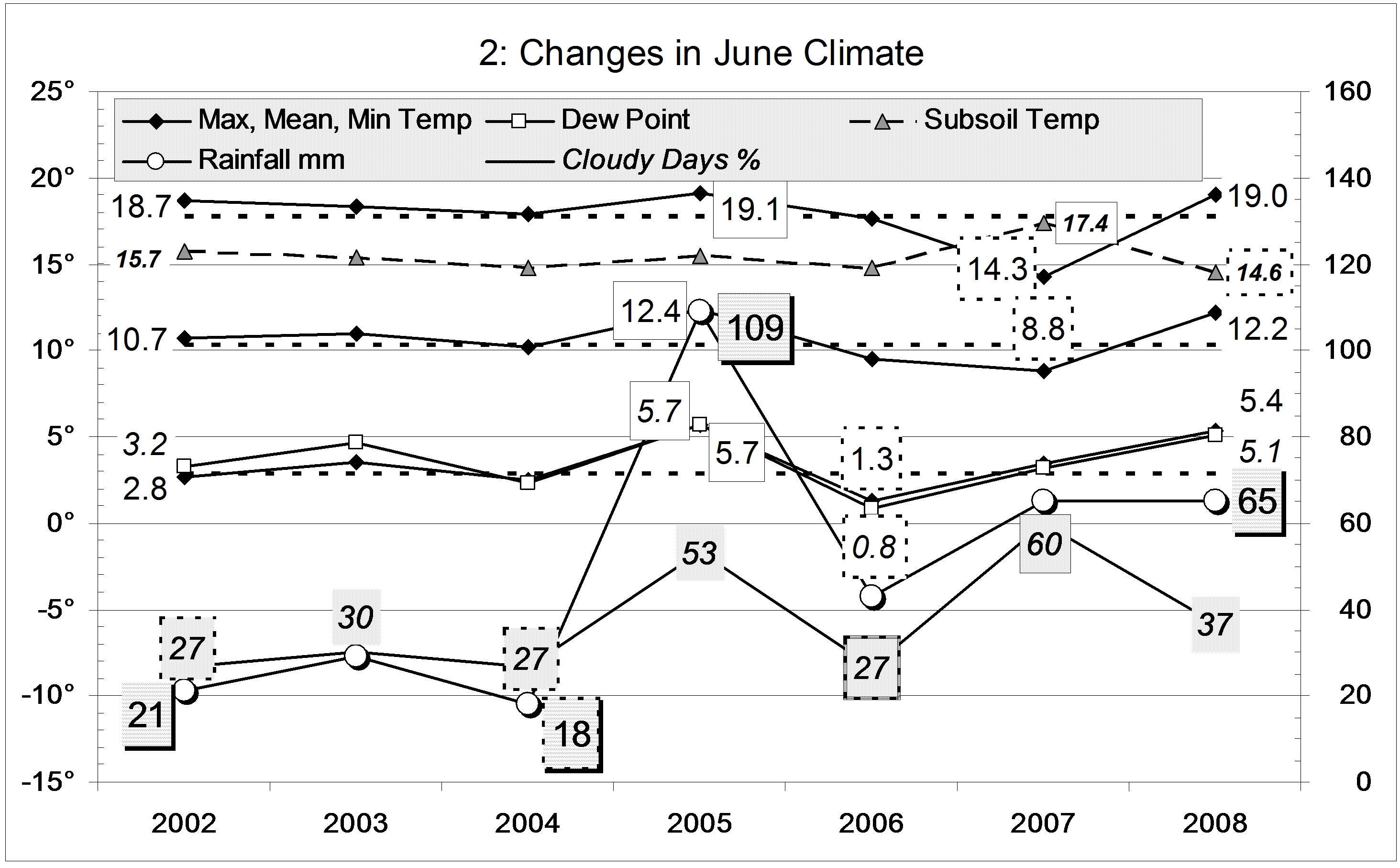 08JunCLI Published July 16, 2014 at 2927 × 1814 in June 2008 warm, with rain « Previous Graphical log of the last seven June months at Manilla, NSW, showing mean values of maximum, minimum and mean temperature, early morning dew point and cloudy days percent, and total monthly rainfall in millimetres.