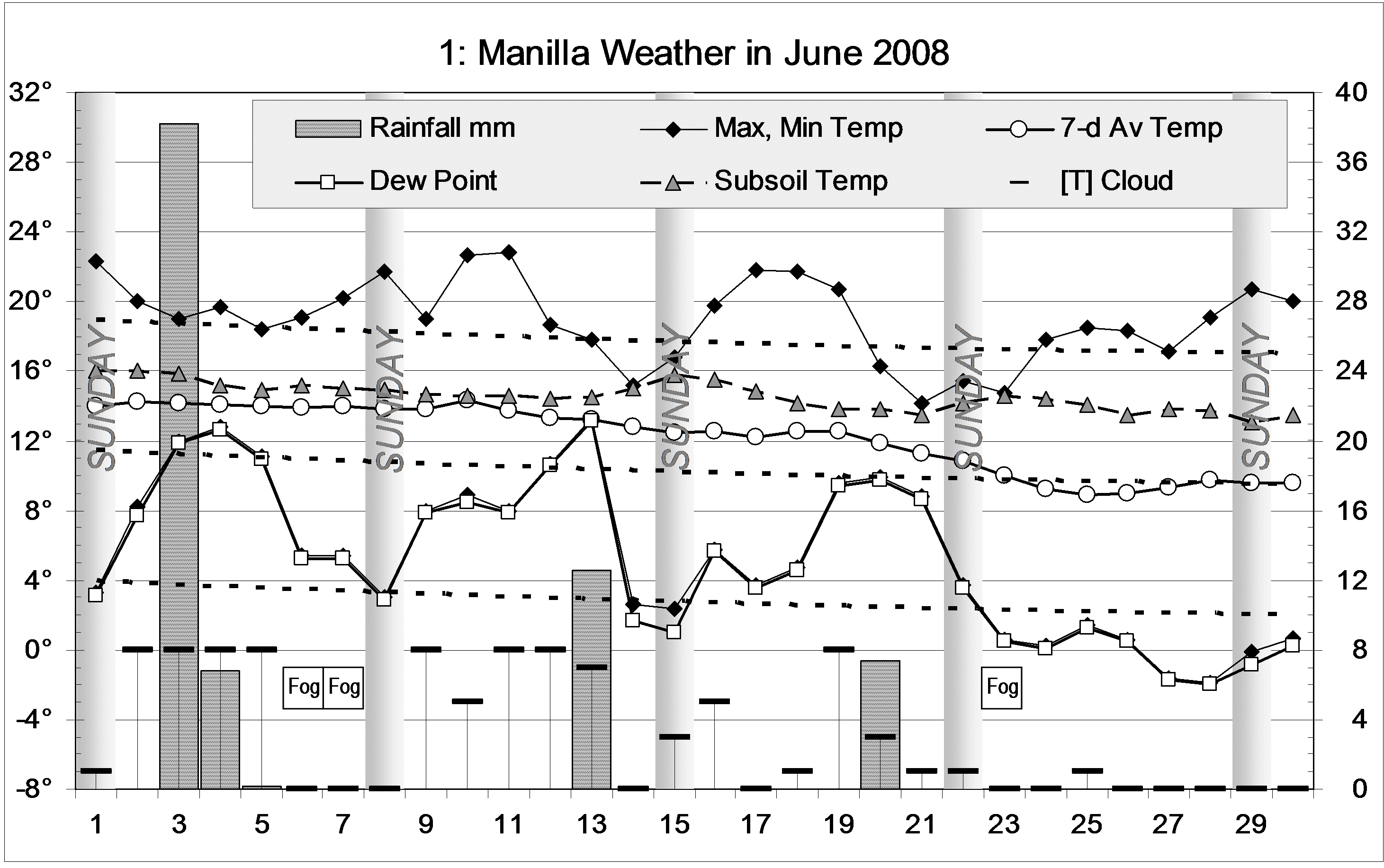 08JunWEA Published July 16, 2014 at 2922 × 1833 in June 2008 warm, with rain Next » Graphical log, for June 2008, of daily values of maximum and minimum temperatures and early morning dew point (all in degrees Celsius), rainfall (mm) and cloud amount (octas). Weekly mean temperature also shown.