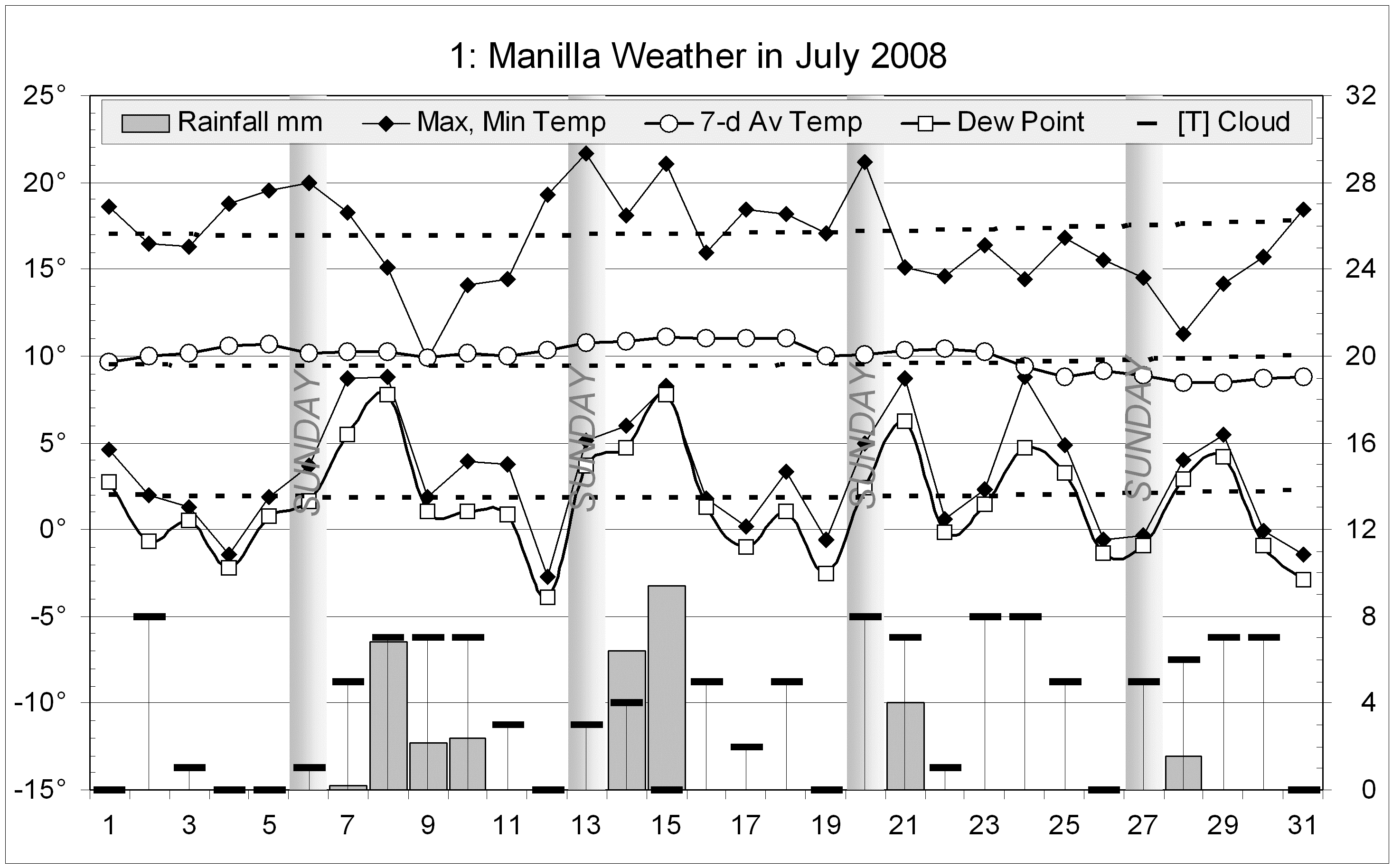 08Julweather Published July 3, 2014 at 2932 × 1829 in July 2008: more cloud, less frost Next » Graphical log, for July 2008, of daily values of maximum and minimum temperatures and early morning dew point (all in degrees Celsius), rainfall (mm) and cloud amount (octas). Weekly mean temperature also shown.