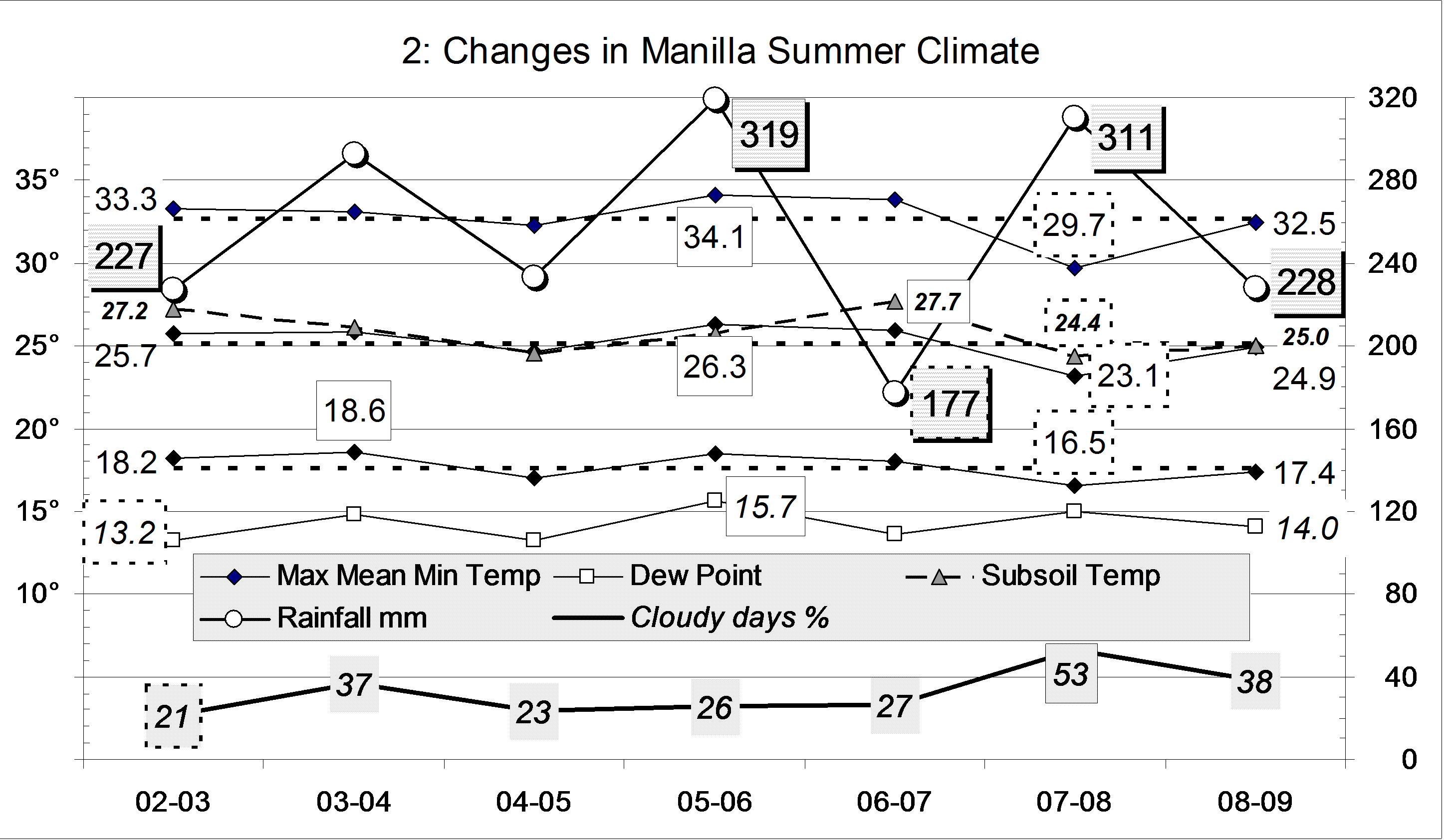 Published October 11, 2014 at 2894 × 1684 in Normal Climate in Summer 2008-09 « Previous Graphical log of the last seven summer seasons at Manilla, NSW, showing mean values of maximum, minimum and mean temperature, soil temperature, early morning dew point and cloudy days percent, and total seasonal rainfall in millimetres.
