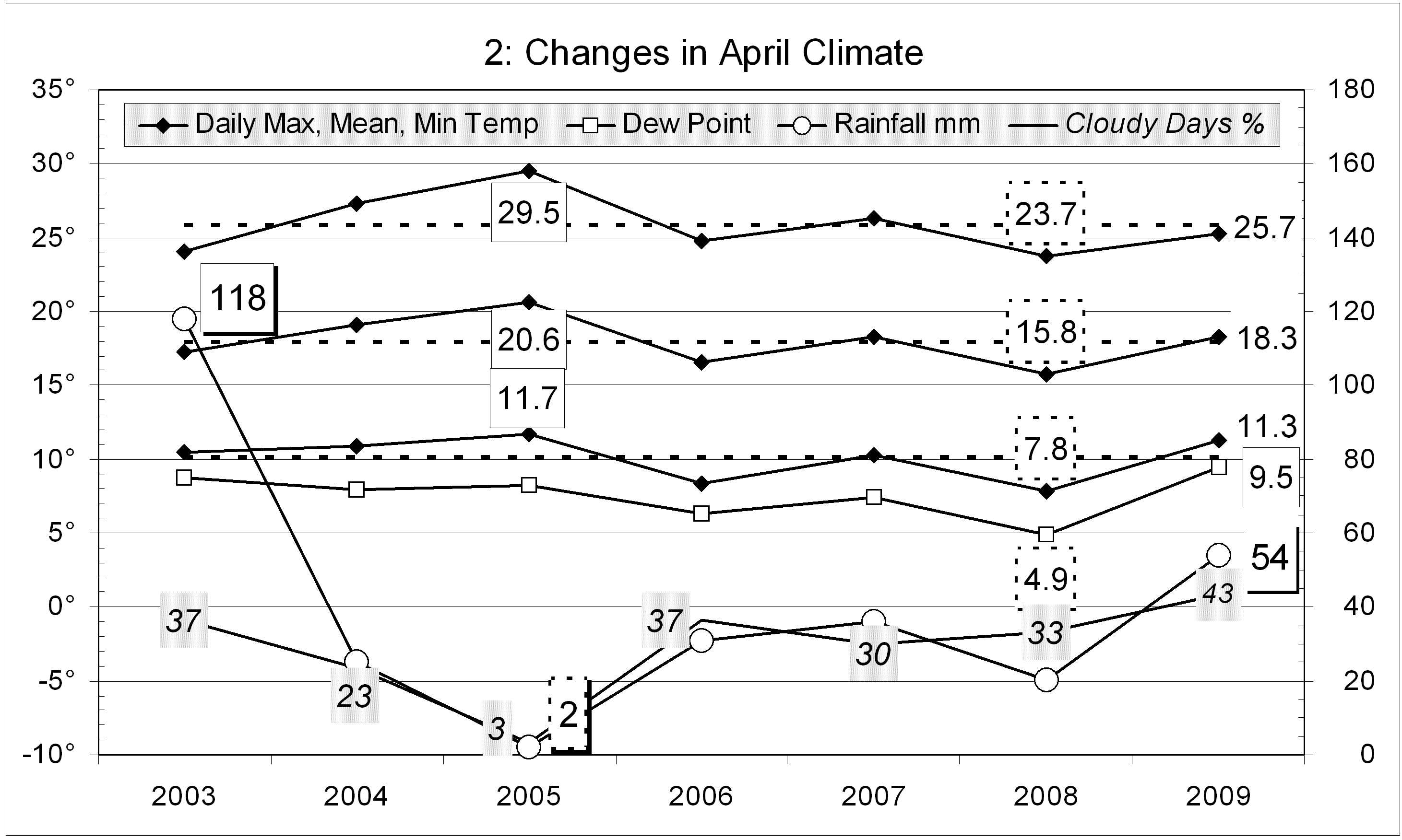 09Aprclimate Published July 2, 2014 at 2922 × 1752 in April showers in 2009 « Previous Graphical log of the last seven April months at Manilla, NSW, showing mean values of maximum, minimum and mean temperature, early morning dew point and cloudy days percent, and total monthly rainfall in millimetres.