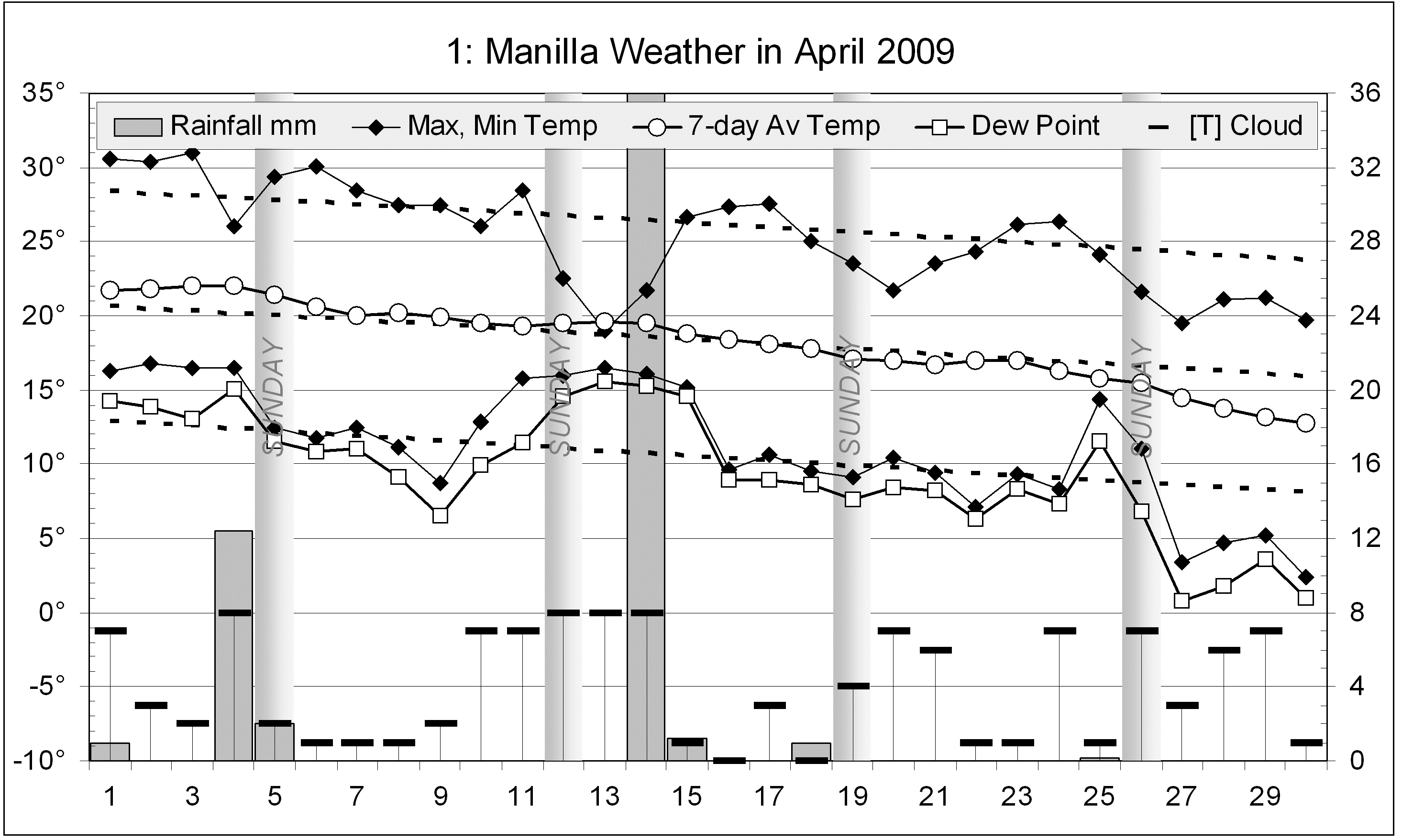 09Aprweather Published July 2, 2014 at 2931 × 1757 in April showers in 2009 Next » Graphical log, for April 2009, of daily values of maximum and minimum temperatures and early morning dew point (all in degrees Celsius), rainfall (mm) and cloud amount (octas). Weekly mean temperature also shown.