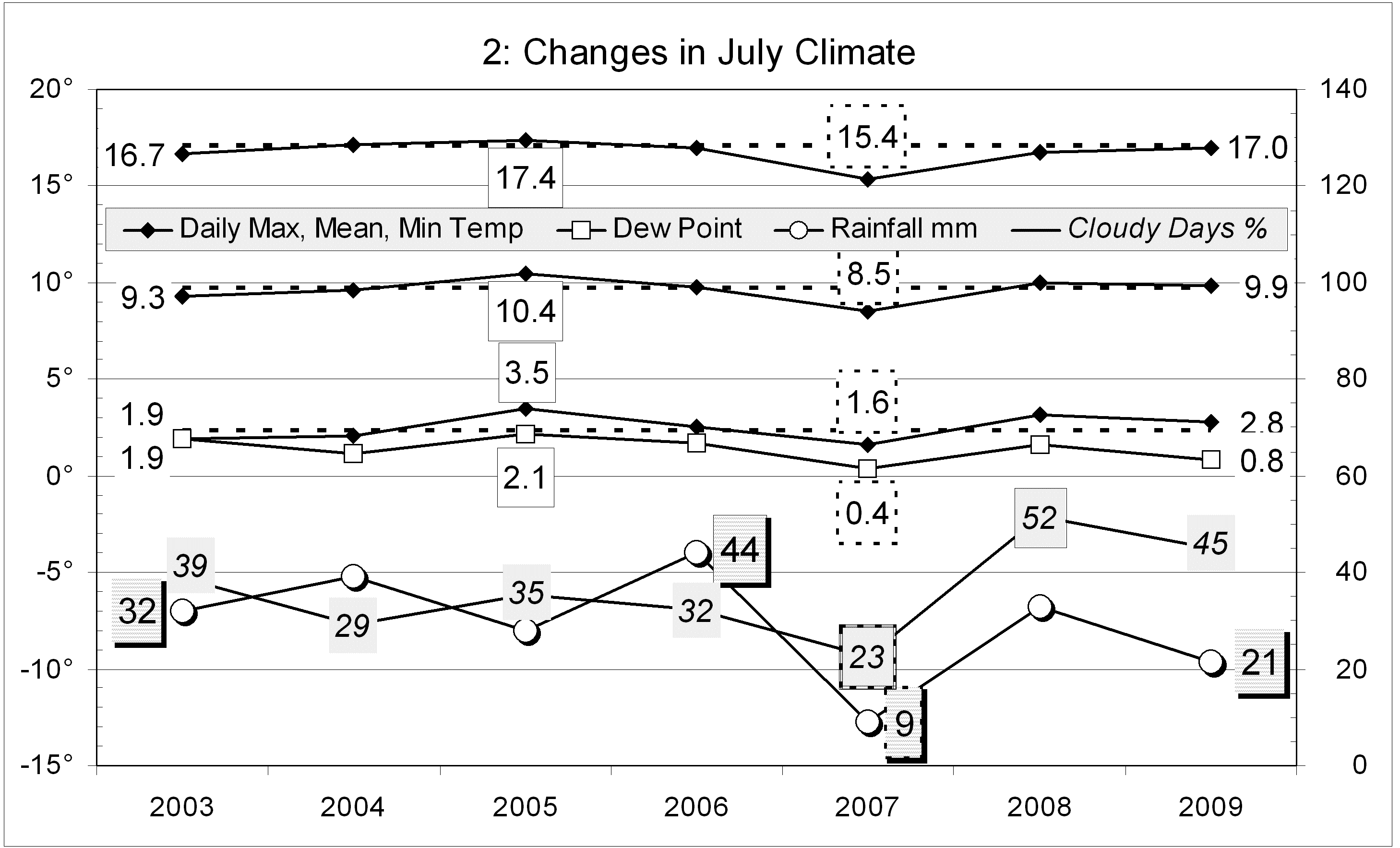09Julclimate Published July 1, 2014 at 2917 × 1767 in July 2009 getting short of rain « Previous Graphical log of the last seven July months at Manilla, NSW, showing mean values of maximum, minimum and mean temperature, early morning dew point and cloudy days percent, and total monthly rainfall in millimetres.
