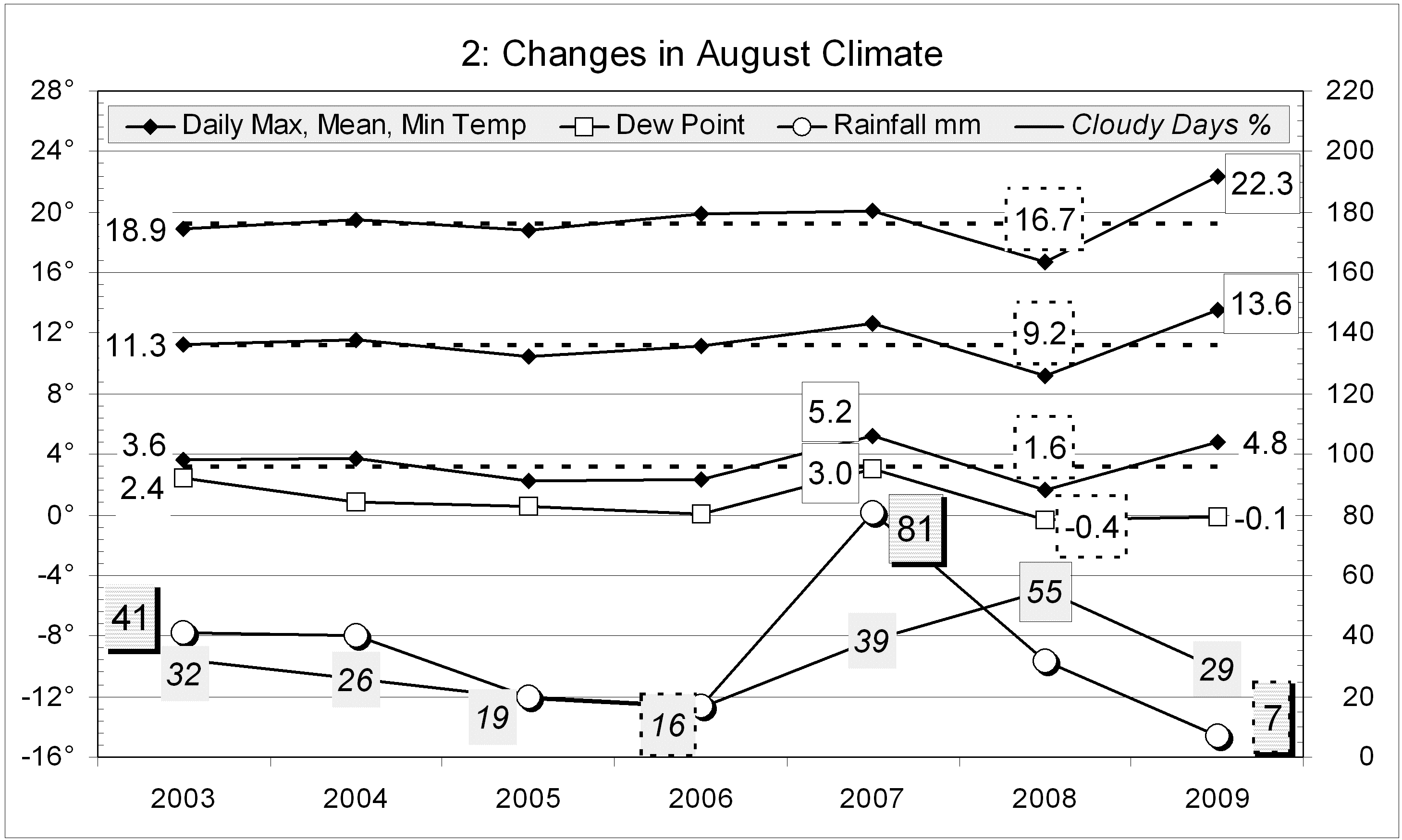 09AugClimate Published July 1, 2014 at 2918 × 1749 in August 2009 HOT and dry « Previous Graphical log of the last seven August months at Manilla, NSW, showing mean values of maximum, minimum and mean temperature, early morning dew point and cloudy days percent, and total monthly rainfall in millimetres.