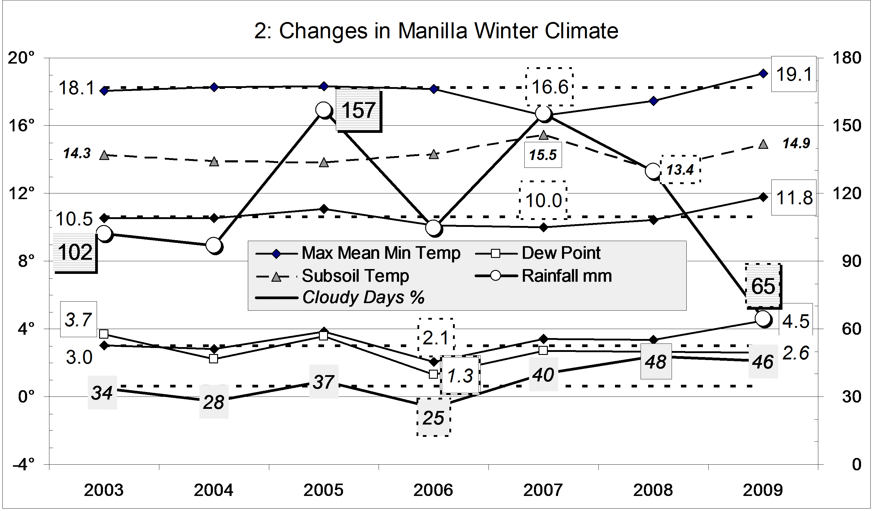 Data. Rainfall data is from Manilla Post Office, courtesy of Phil Pinch. Dew Point values before August 2005 are from Tamworth Airport 6am data supplied by the Bureau of Meteorology. Temperature and other data are from 3 Monash Street, Manilla.