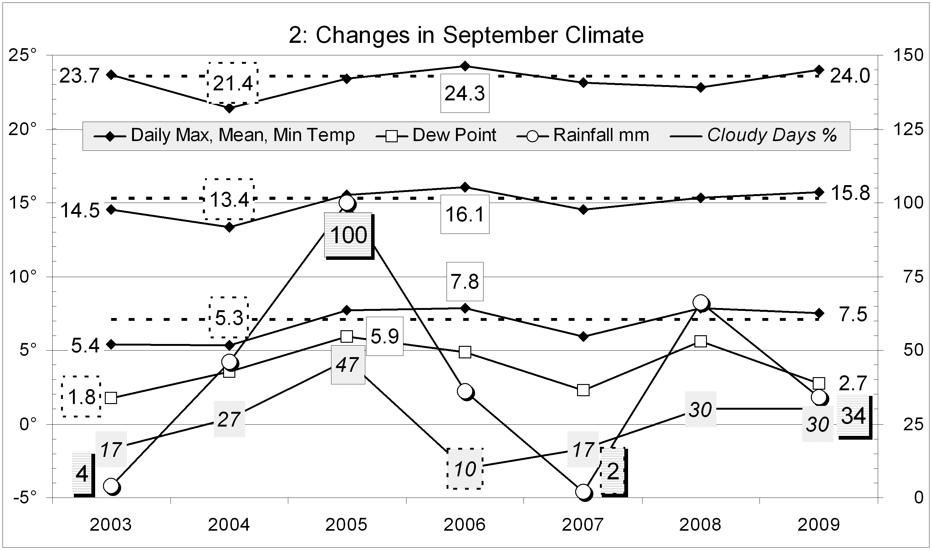 09SepClimate Published July 1, 2014 at 2975 × 1762 in September 2009 warm and dusty « Previous Graphical log of the last seven September months at Manilla, NSW, showing mean values of maximum, minimum and mean temperature, early morning dew point and cloudy days percent, and total monthly rainfall in millimetres.