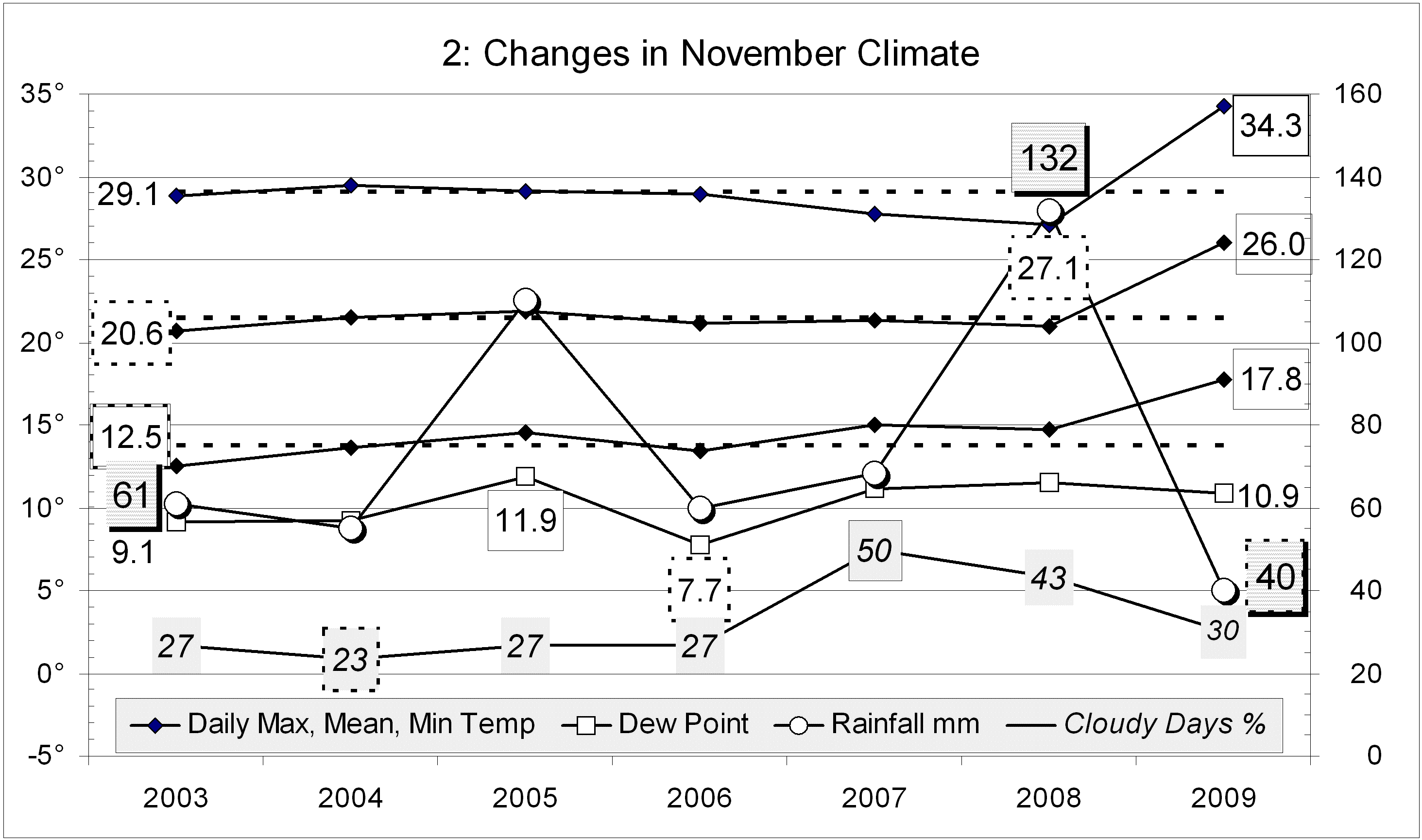 09Novclimate Published July 1, 2014 at 2927 × 1729 in November 2009 – Extreme Heat « Previous Graphical log of the last seven November months at Manilla, NSW, showing mean values of maximum, minimum and mean temperature, early morning dew point and cloudy days percent, and total monthly rainfall in millimetres.