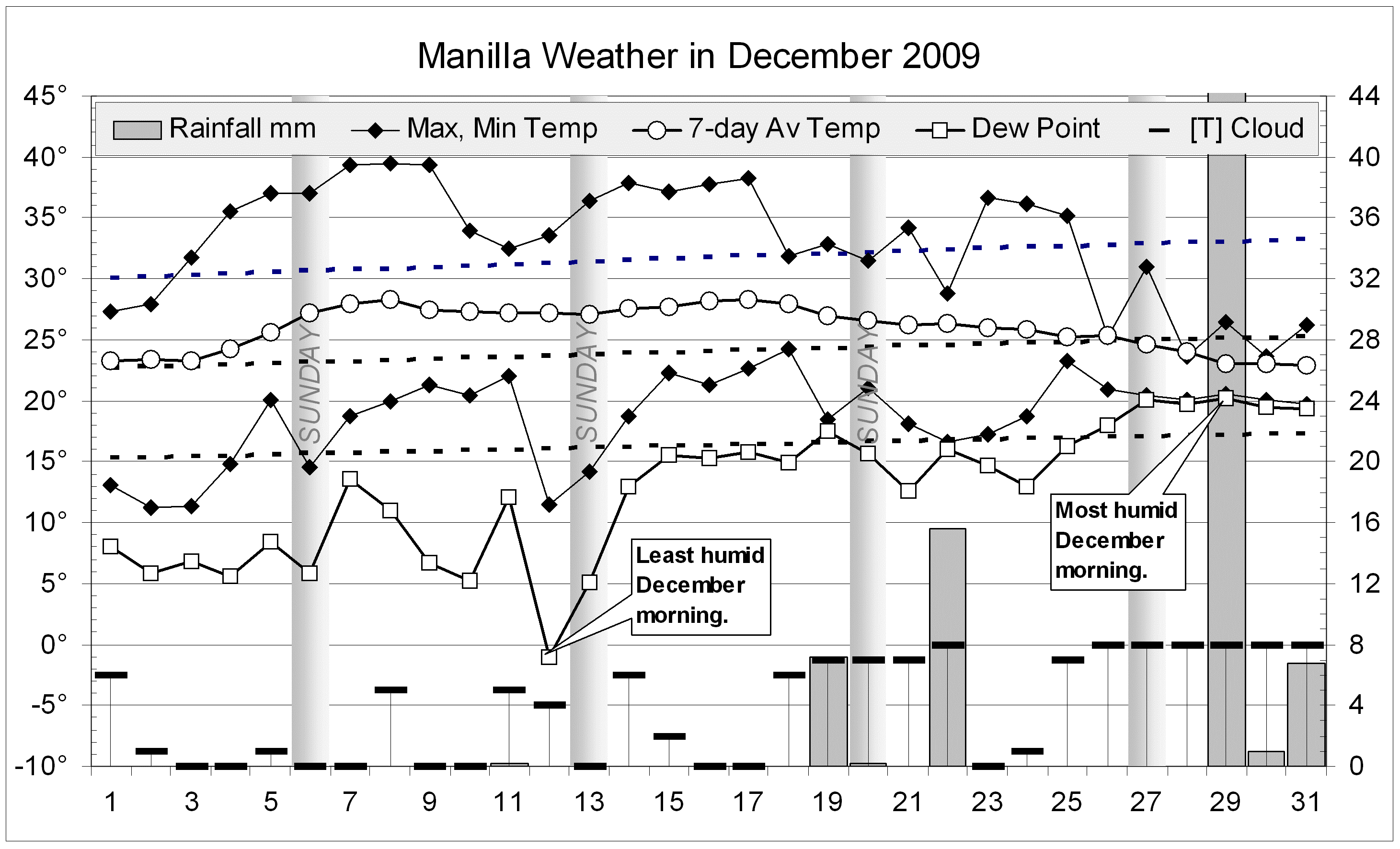 09Decweather Published July 1, 2014 at 2922 × 1772 in Parched December 2009 went soggy Next » Graphical log, for December 2009, of daily values of maximum and minimum temperatures and early morning dew point (all in degrees Celsius), rainfall (mm) and cloud amount (octas). Weekly mean temperature also shown.