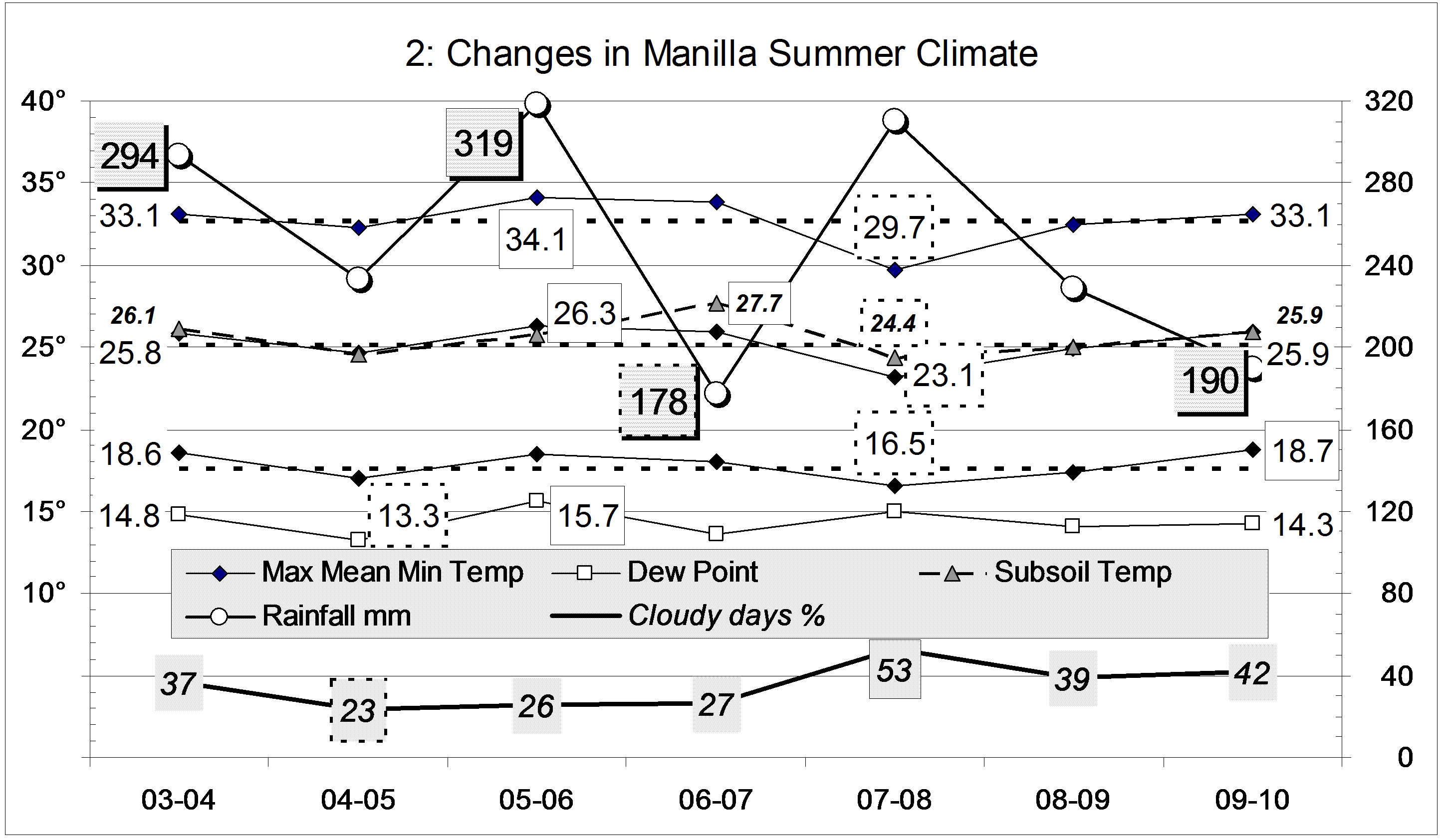 Published October 11, 2014 at 2886 × 1684 in Warm Nights in Summer 2009-10 « Previous Graphical log of the last seven summer seasons at Manilla, NSW, showing mean values of maximum, minimum and mean temperature, soil temperature, early morning dew point and cloudy days percent, and total seasonal rainfall in millimetres.