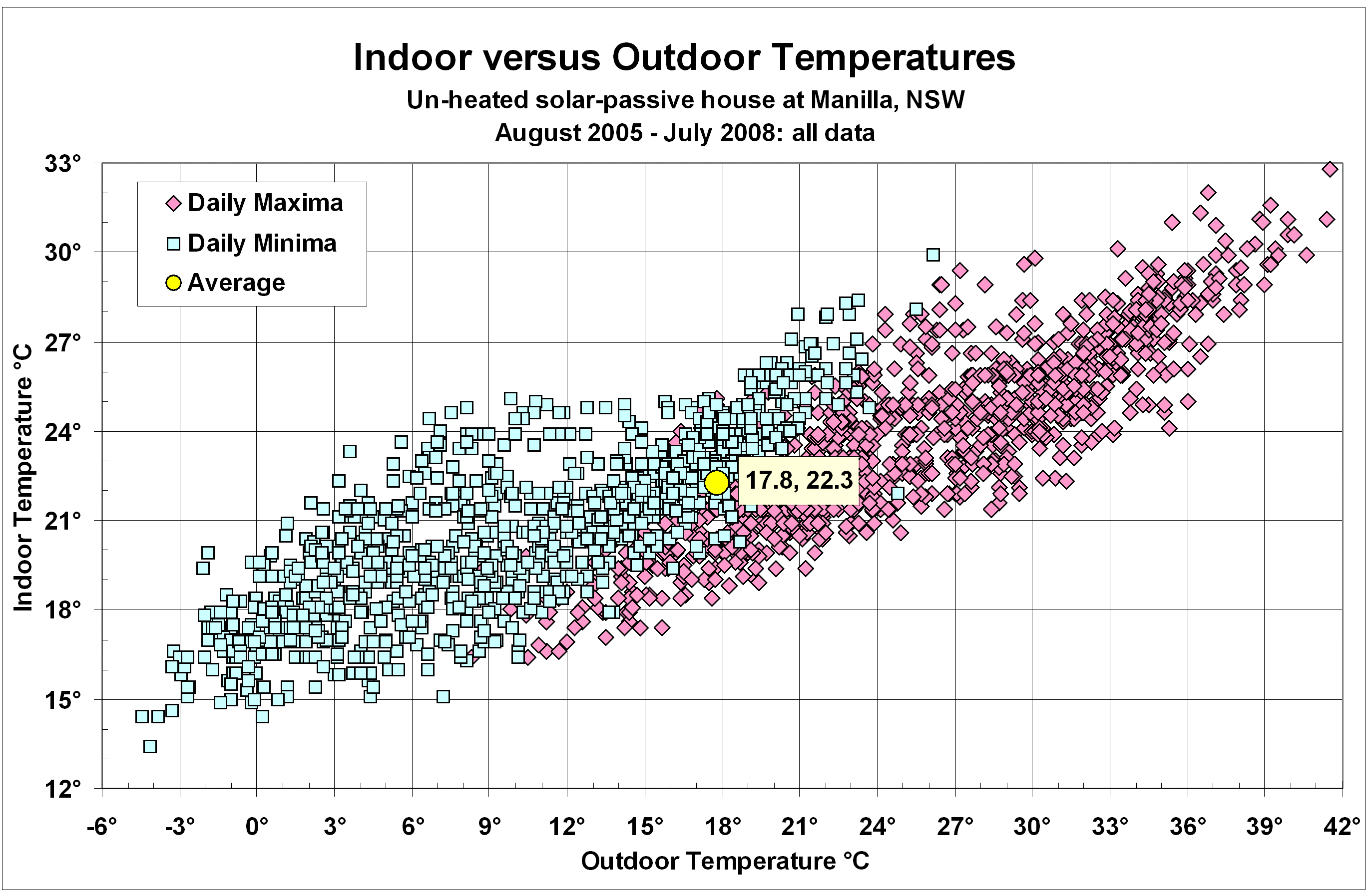 IOAug05Jul08 Published July 9, 2014 at 2745 × 1795 in Indoor versus Outdoor Temperatures (1096 days) Scatter plot of all indoor and outdoor maximum and minimum temperatures for the three years from August 2005. Data for a solar-passive house at Manilla NSW.