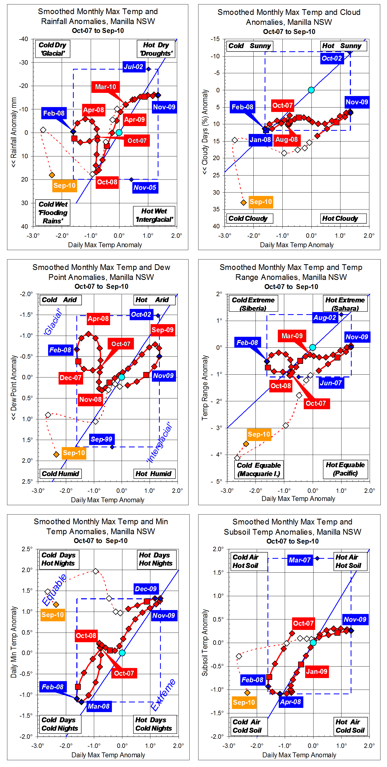 The September 2010 data, marked with orange diamonds, are in the “Flooding Rains” area in the bottom left corner of five of the six graphs. Anomaly values of rainfall, cloudy days, Dew Point, temperature range and subsoil temperature are extreme. The Minimum temperature anomaly has remained very high for a year.