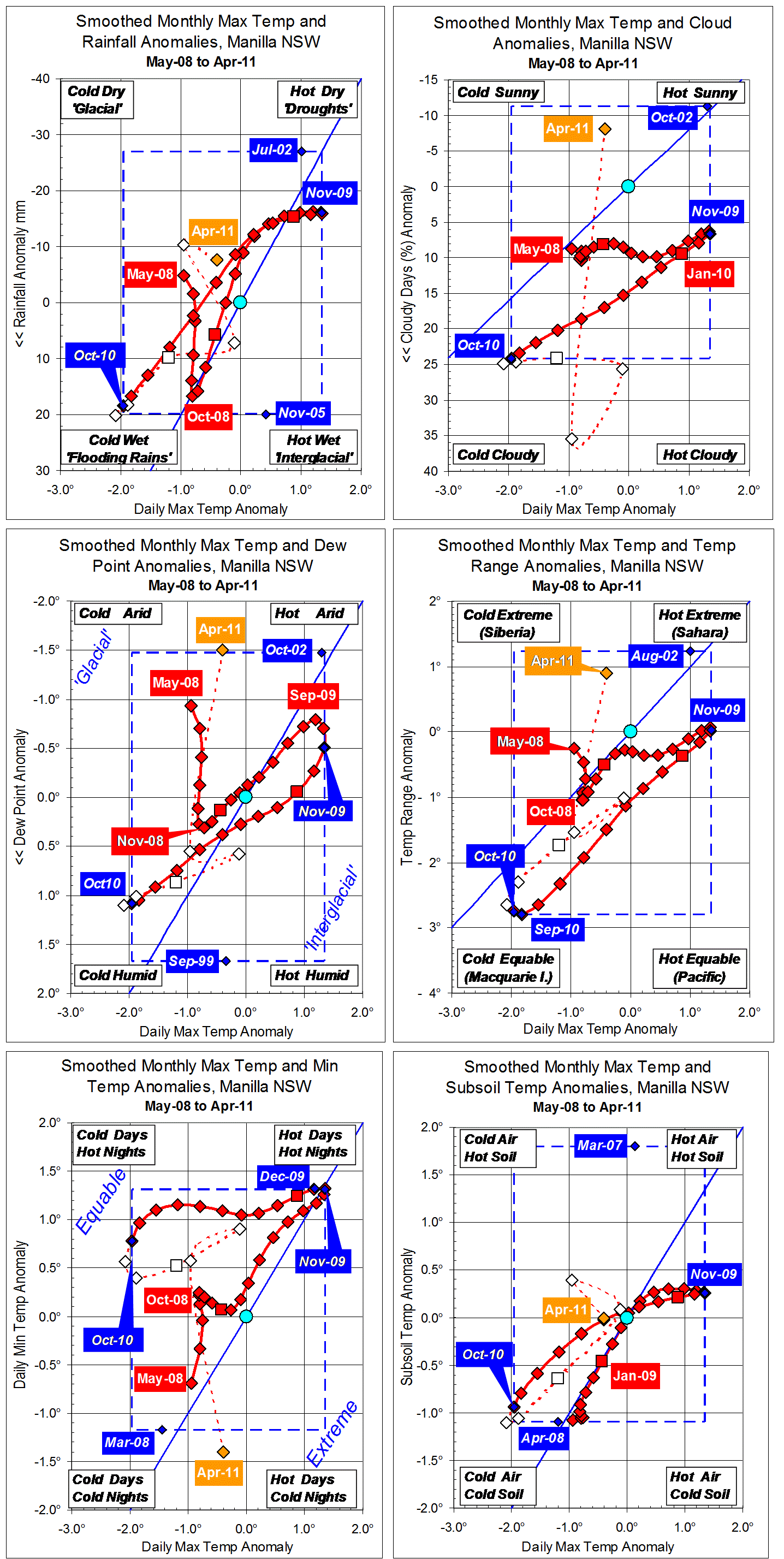 Most of the April 2011 raw data values (in orange), other than daily maximum temperature, are now on the “droughts” side of normal rather than the “flooding rains” side, which had dominated for about a year.