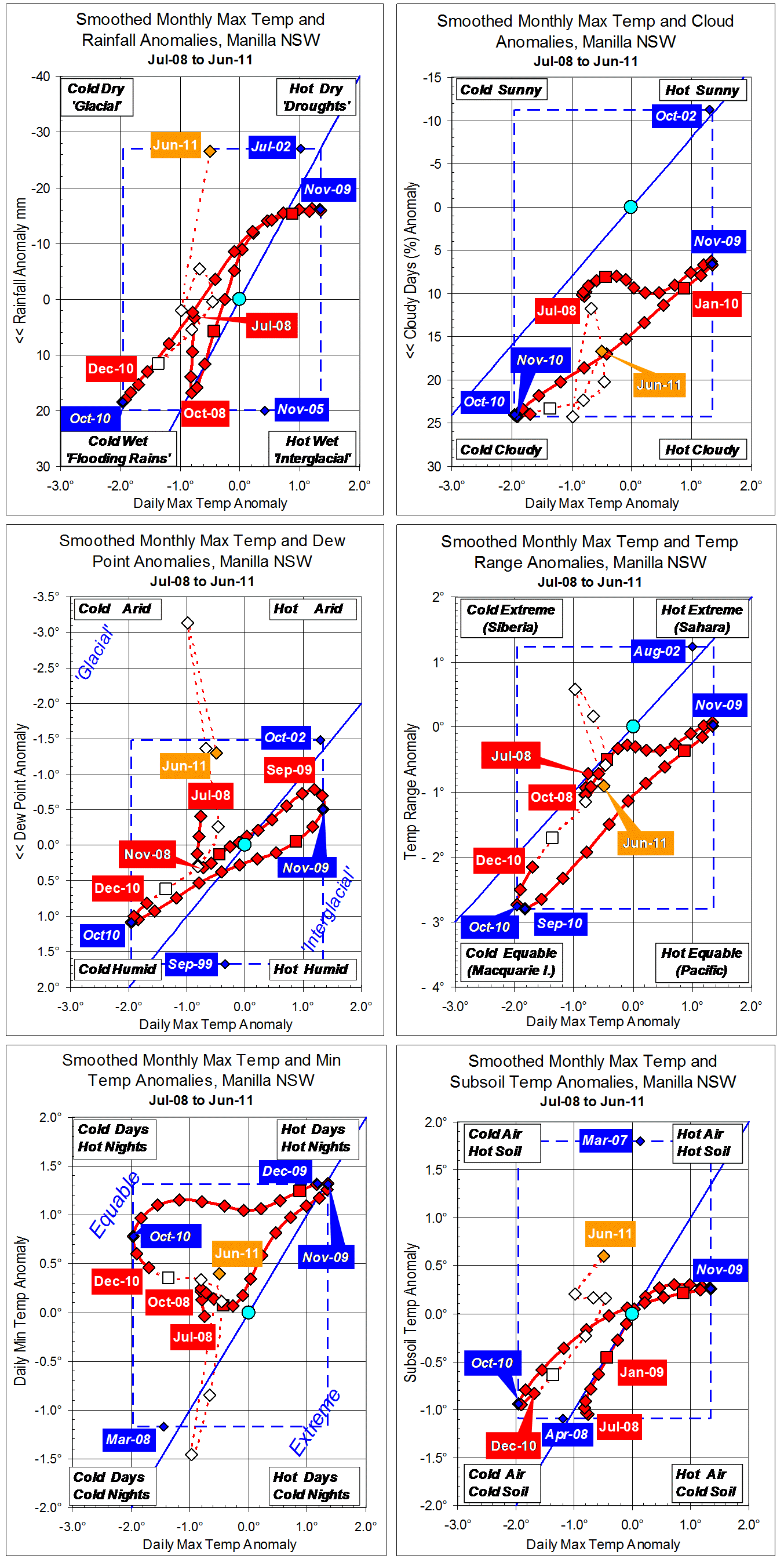 Daily max temperature, shown on the x-axis of all six graphs, has stalled without quite rising to normal from the extreme cold of last October.