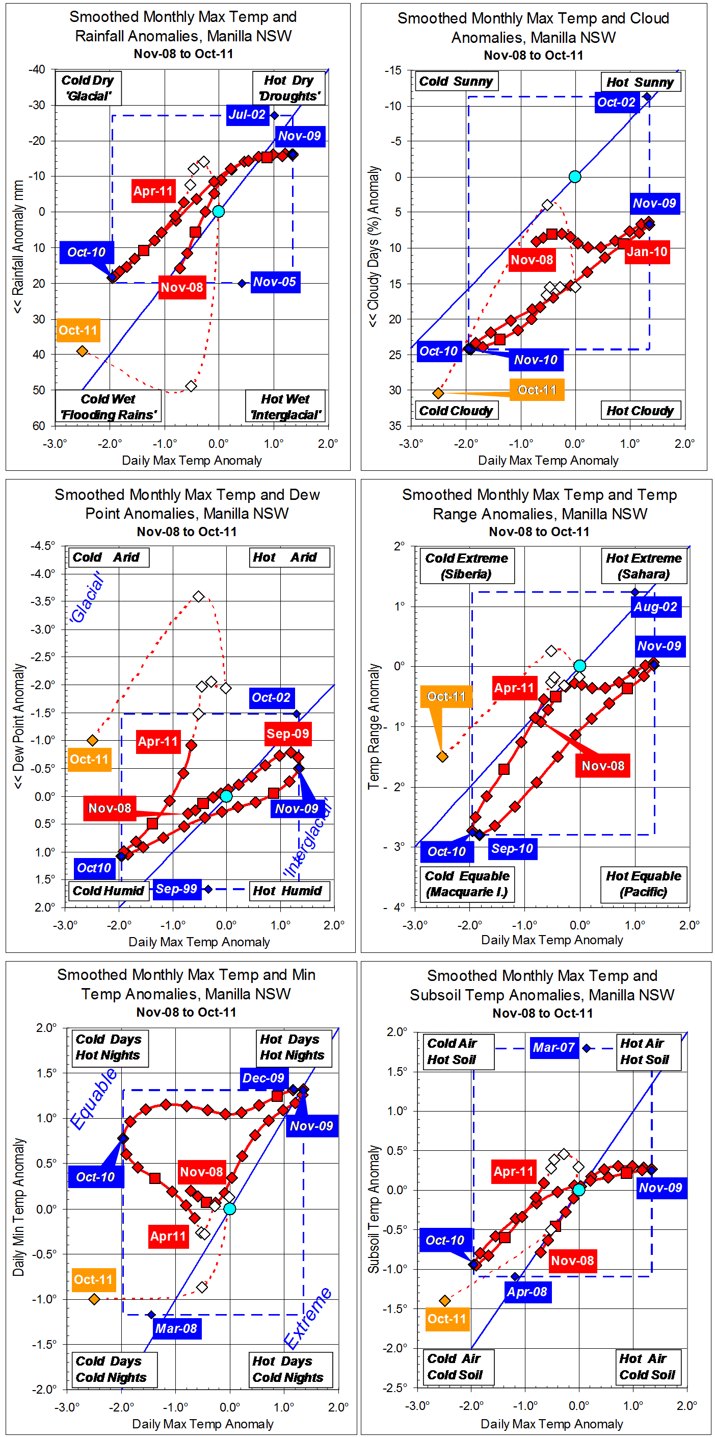 Raw values of some climate variables for October 2011 are like those of October 2010 which, when smoothed, turned out to be a record cold-wet climate peak. Using the two sets of graphs (above and below), one can see: