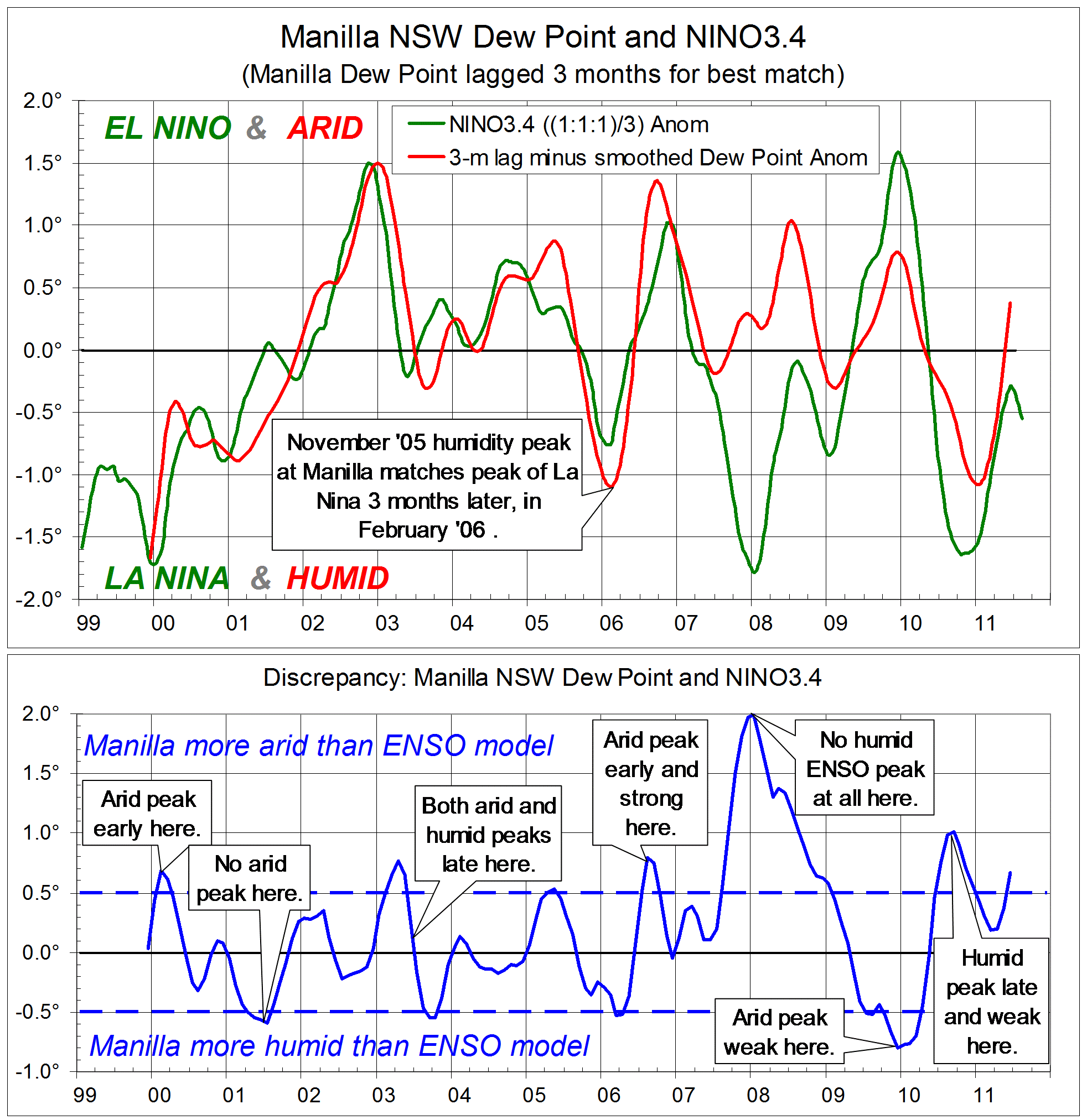 DewPtNINO3.4 Published June 29, 2014 at 1964 × 2025 in Manilla Dew Point leads ENSO by three months A 140-month log of smoothed early morning dew point at Manilla, NSW is shown to match the NINO3.4 sea surface temperature log in many features. Manilla dew point leads NINO3.4 by 3 months. Discrepancies are also shown.