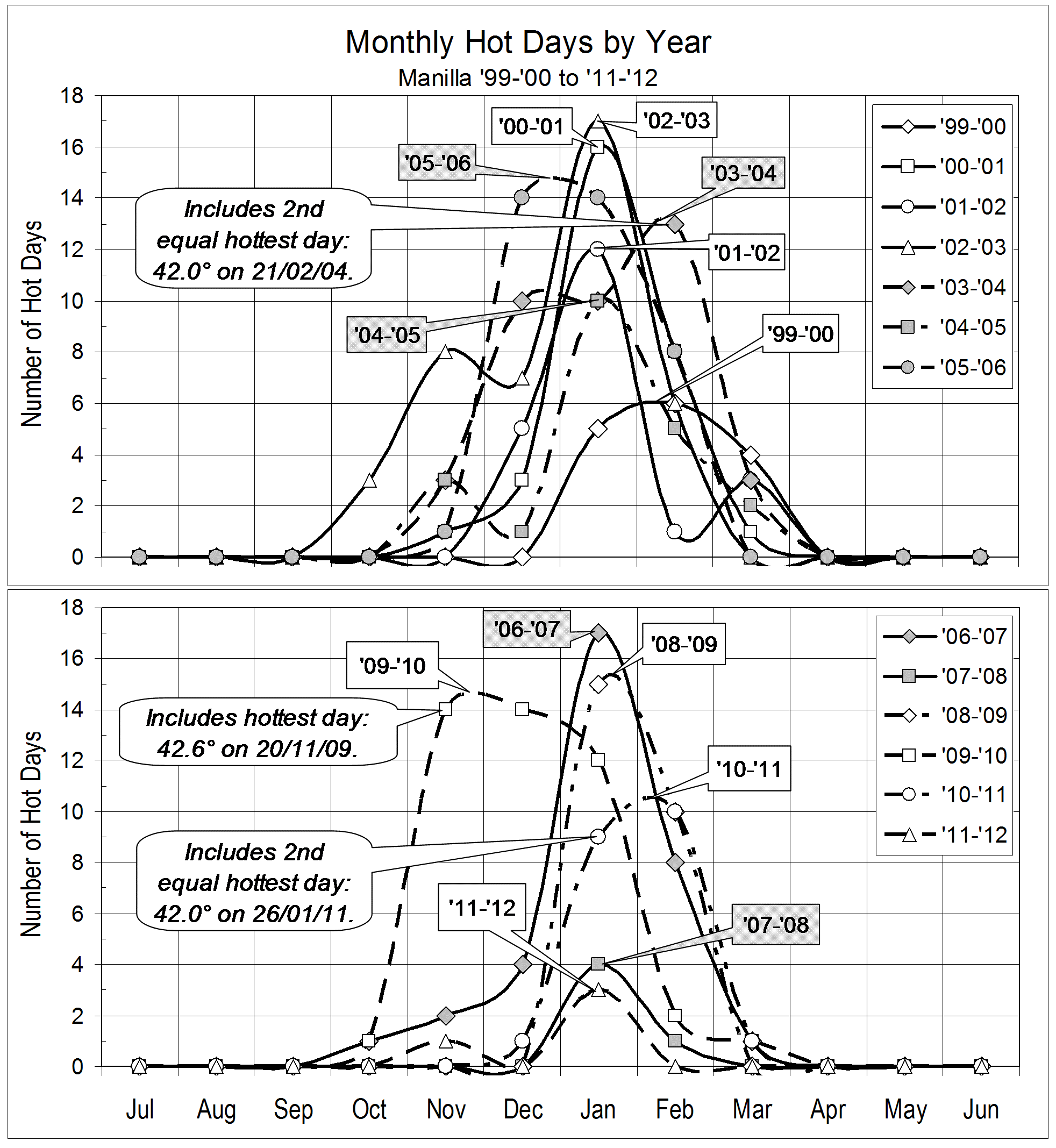 Published July 6, 2014 at 1964 × 2135 in Manilla’s Hot Days « Previous Curves follow the number of hot days each calendar month in the years 99/00 to 11/12.