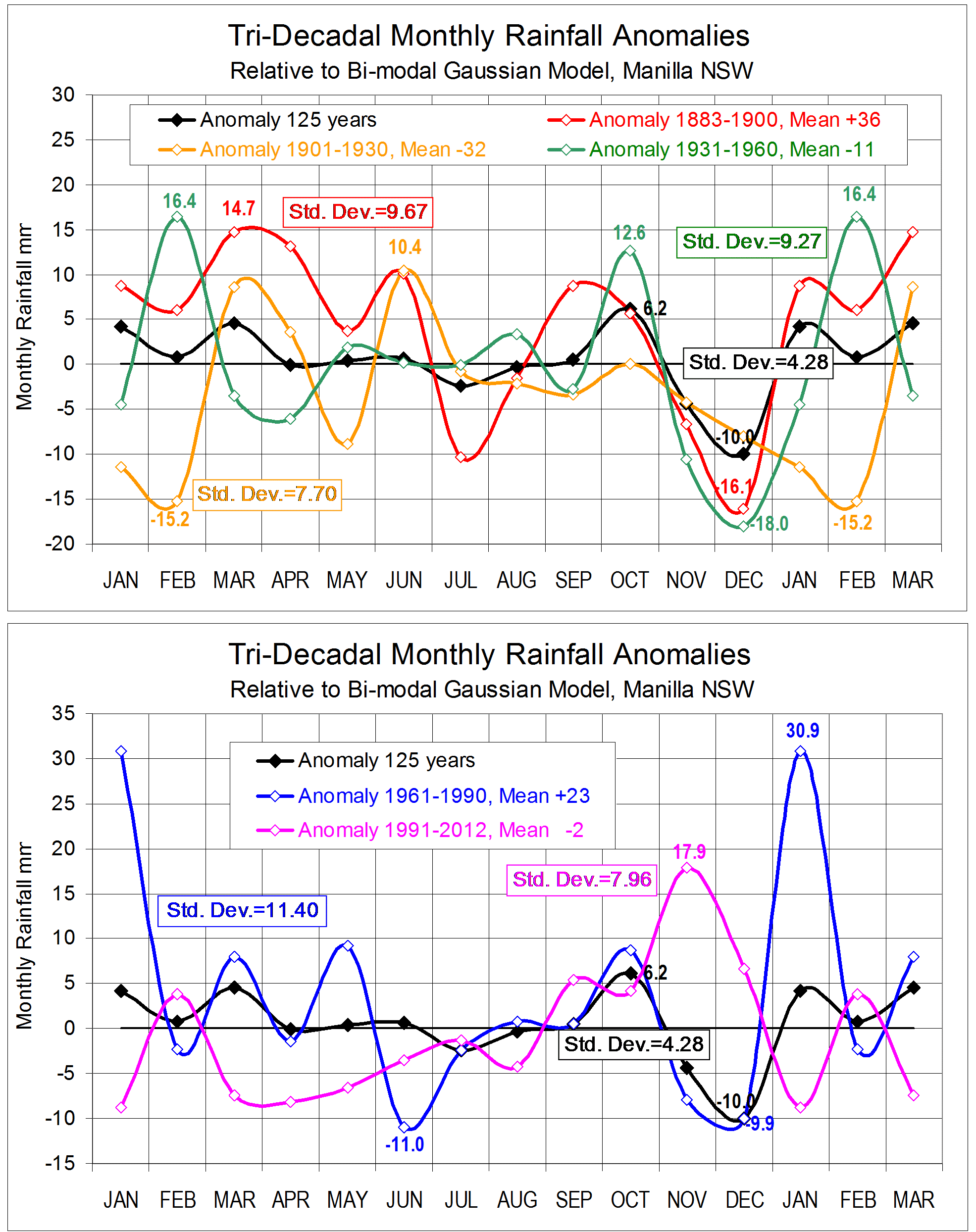 In an earlier post I modelled the seasonal distribution of rainfall at Manilla, NSW, as a bi-modal Gaussian distribution with a higher Gaussian peak very close to the summer solstice and a lower one very close to the winter solstice.