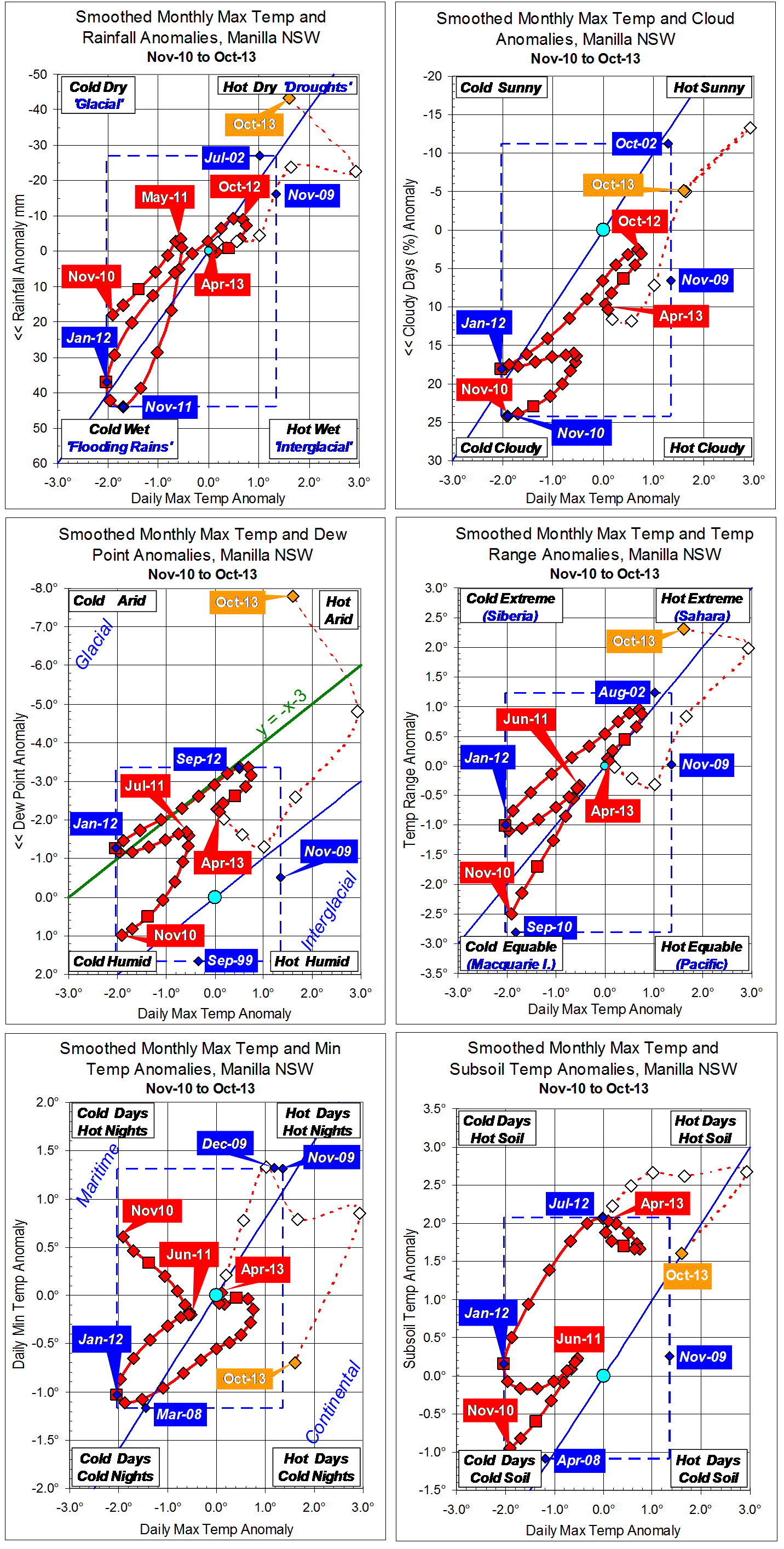 Of the raw values of climate anomalies in October 2013, daily maximum temperature, among others, fell back from the extreme high reached in September. However, rainfall and dew point became extremely low, and temperature range extremely wide, suggesting extreme drought.