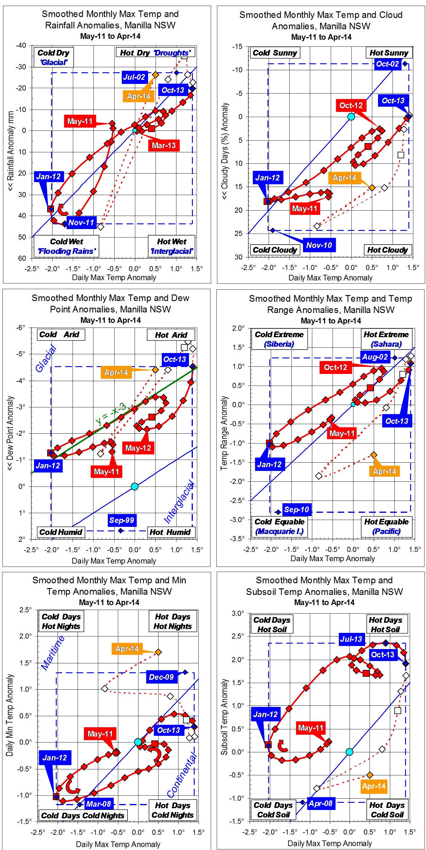 After a very cool moist March, raw values of climate anomalies for April 2014 are nearly all back near the (slightly smoothed) values for February. However, neither month was as hot or dry as December or January.