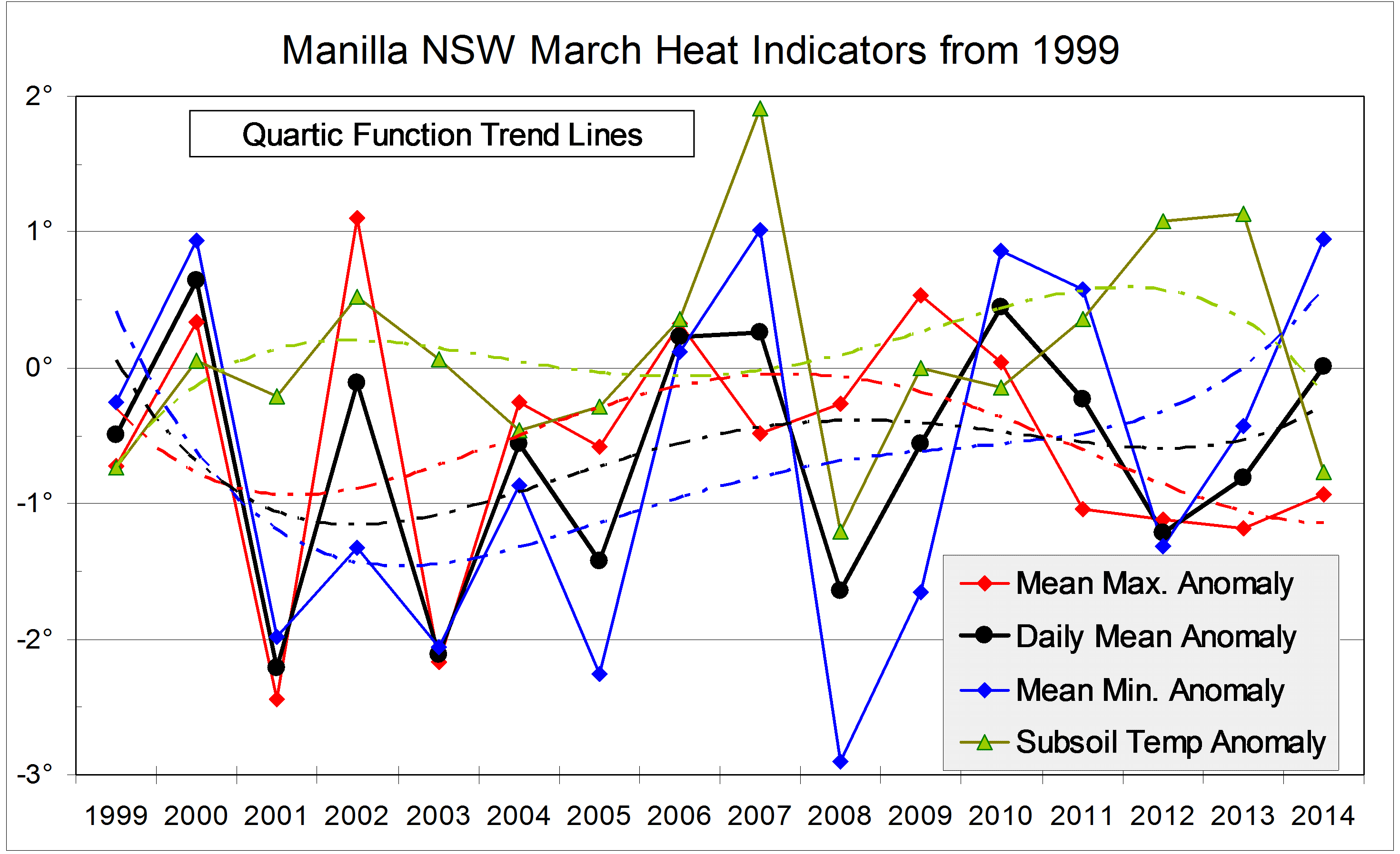 March Heat Published July 20, 2014 at 2941 × 1796 in March Climate Anomalies Log Next » Graphical log of the climate variable anomalies that are grouped as Heat Indicators for March months 1999 to 2014. Data for Manilla NSW. Quartic trend lines added.