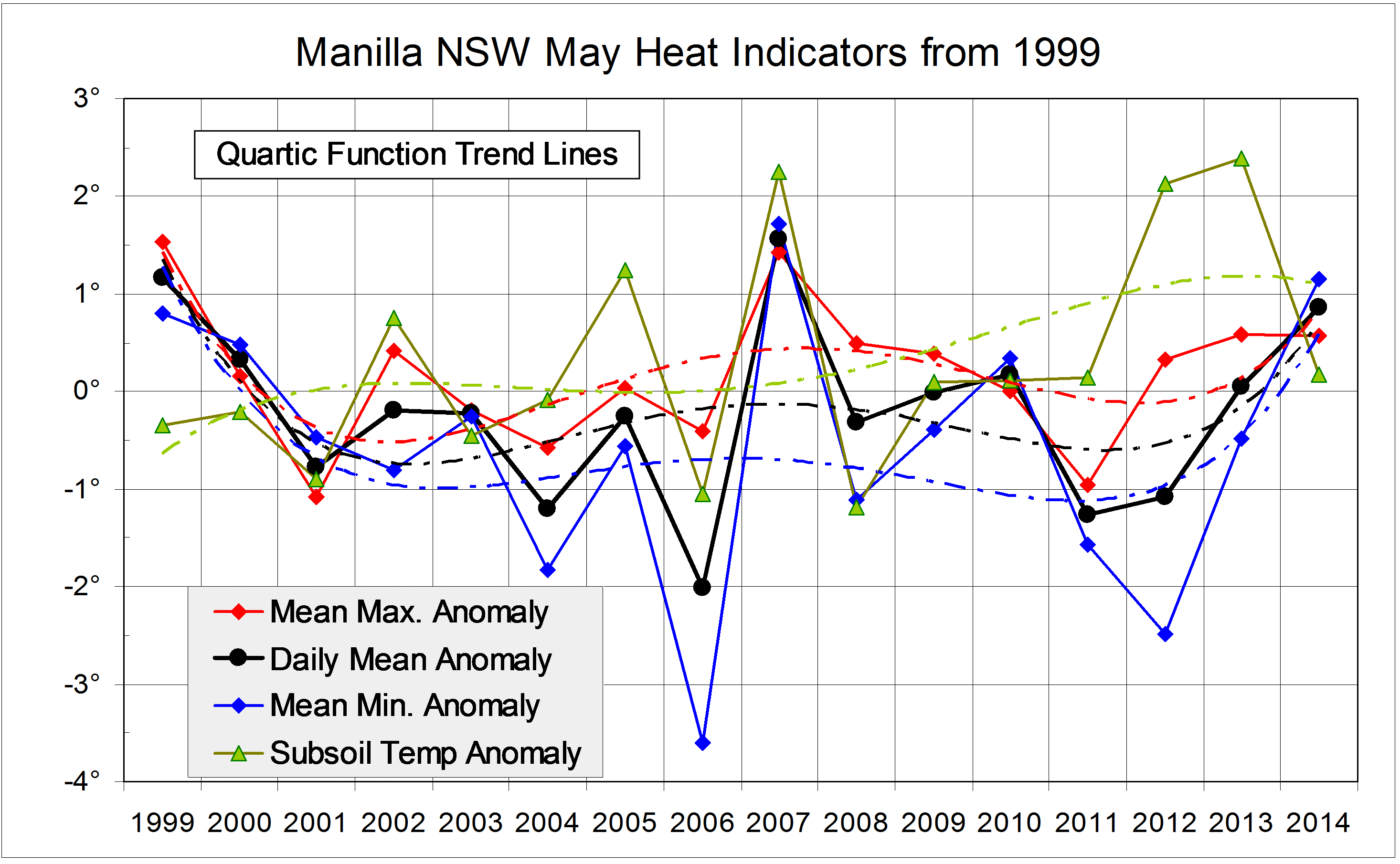 May Heat Published July 21, 2014 at 2932 × 1810 in May Climate Anomalies Log Next » Graphical log of the climate variable anomalies that are grouped as Heat Indicators for May months 1999 to 2014. Data for Manilla NSW. Quartic trend lines added.