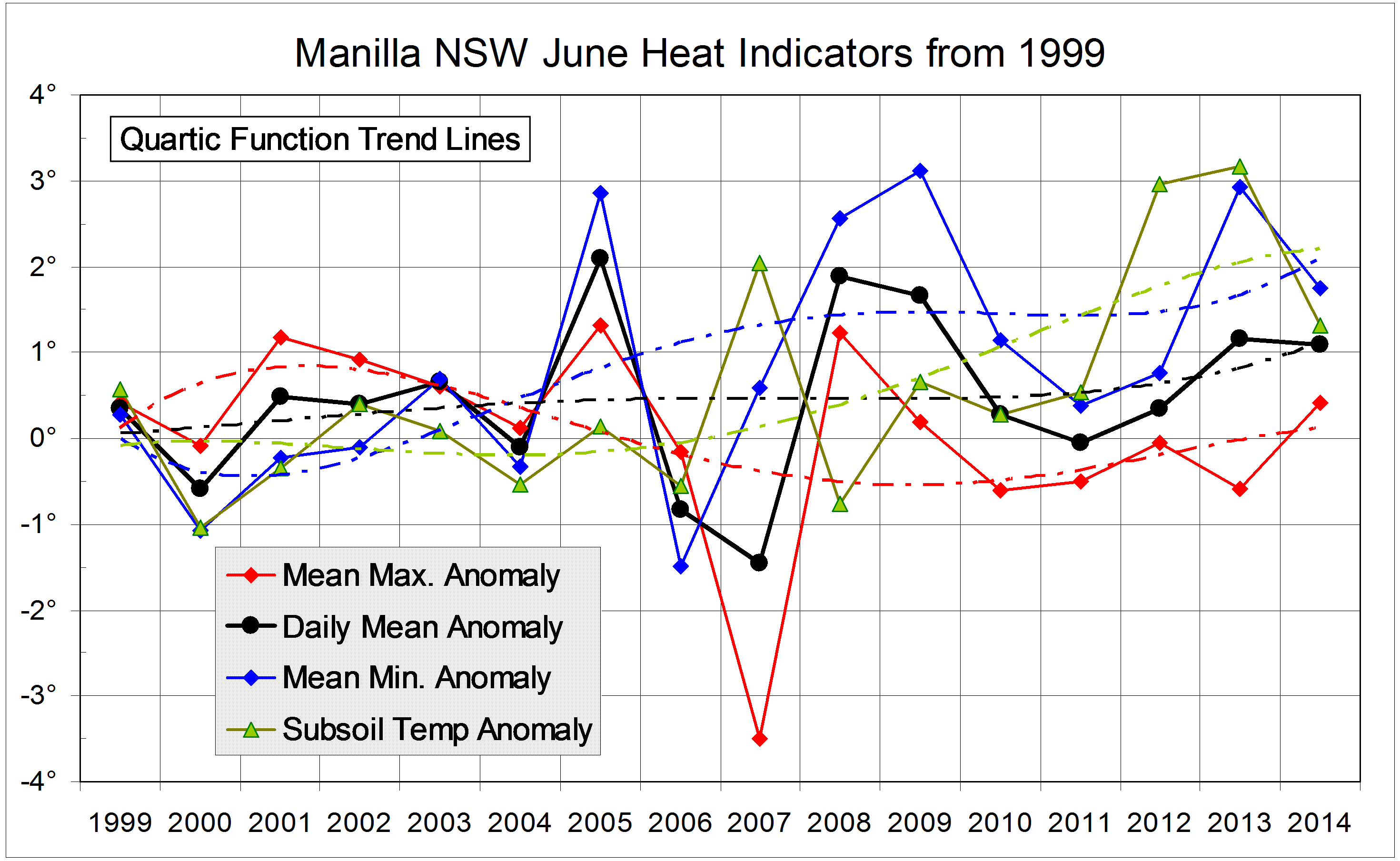 June Heat Published July 22, 2014 at 2941 × 1809 in June Climate Anomalies Log Next » Graphical log of the climate variable anomalies that are grouped as Heat Indicators for June months 1999 to 2014. Data for Manilla NSW. Quartic trend lines added.