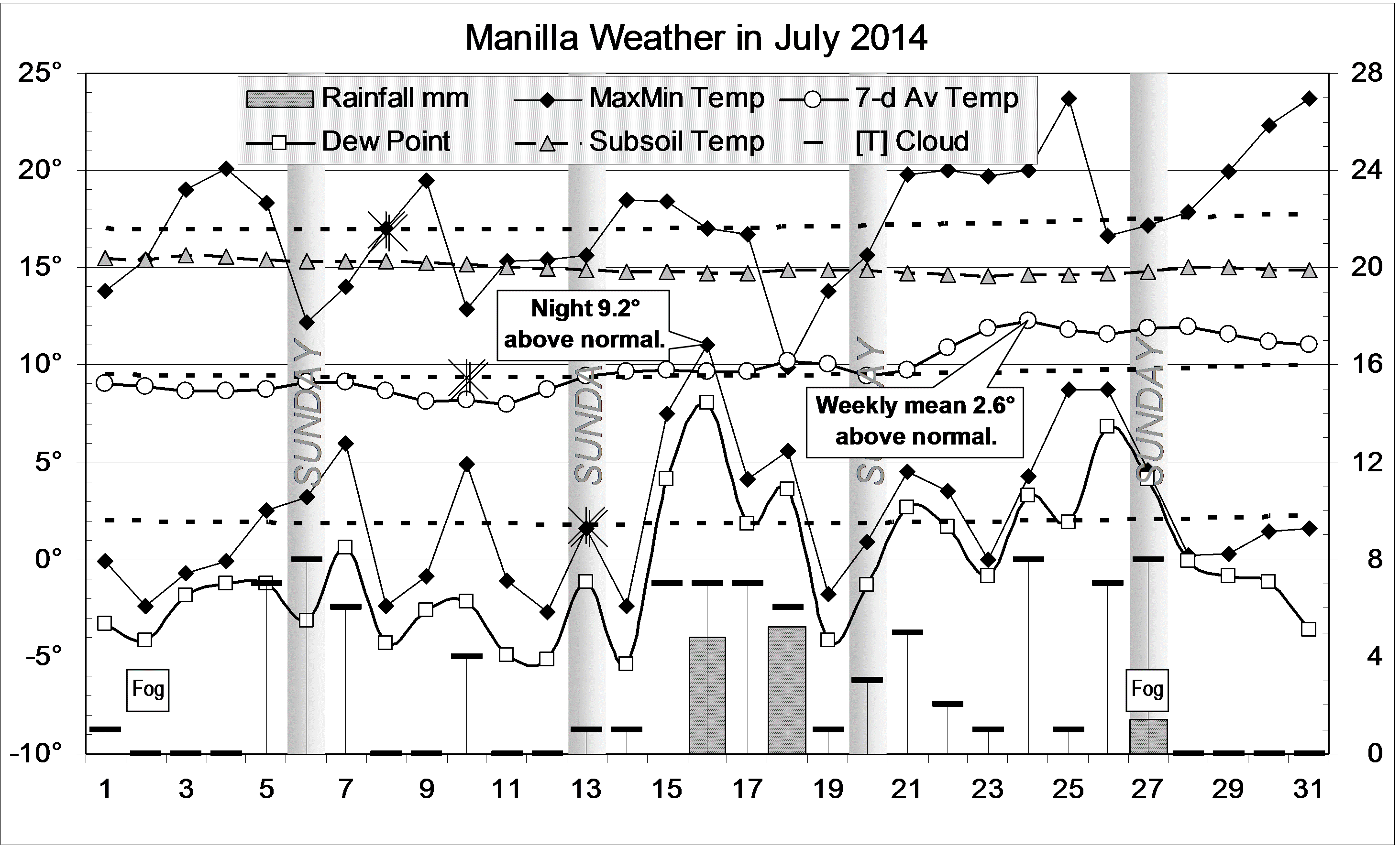 14Julyweather Published August 2, 2014 at 2927 × 1772 in Dry July 2014 « Previous Next » Graphical log, for July 2014, of daily values of maximum and minimum temperatures, subsoil (750mm) temperature and early morning dew point (all in degrees Celsius), rainfall (mm) and cloud amount (octas). Weekly mean temperature also shown.