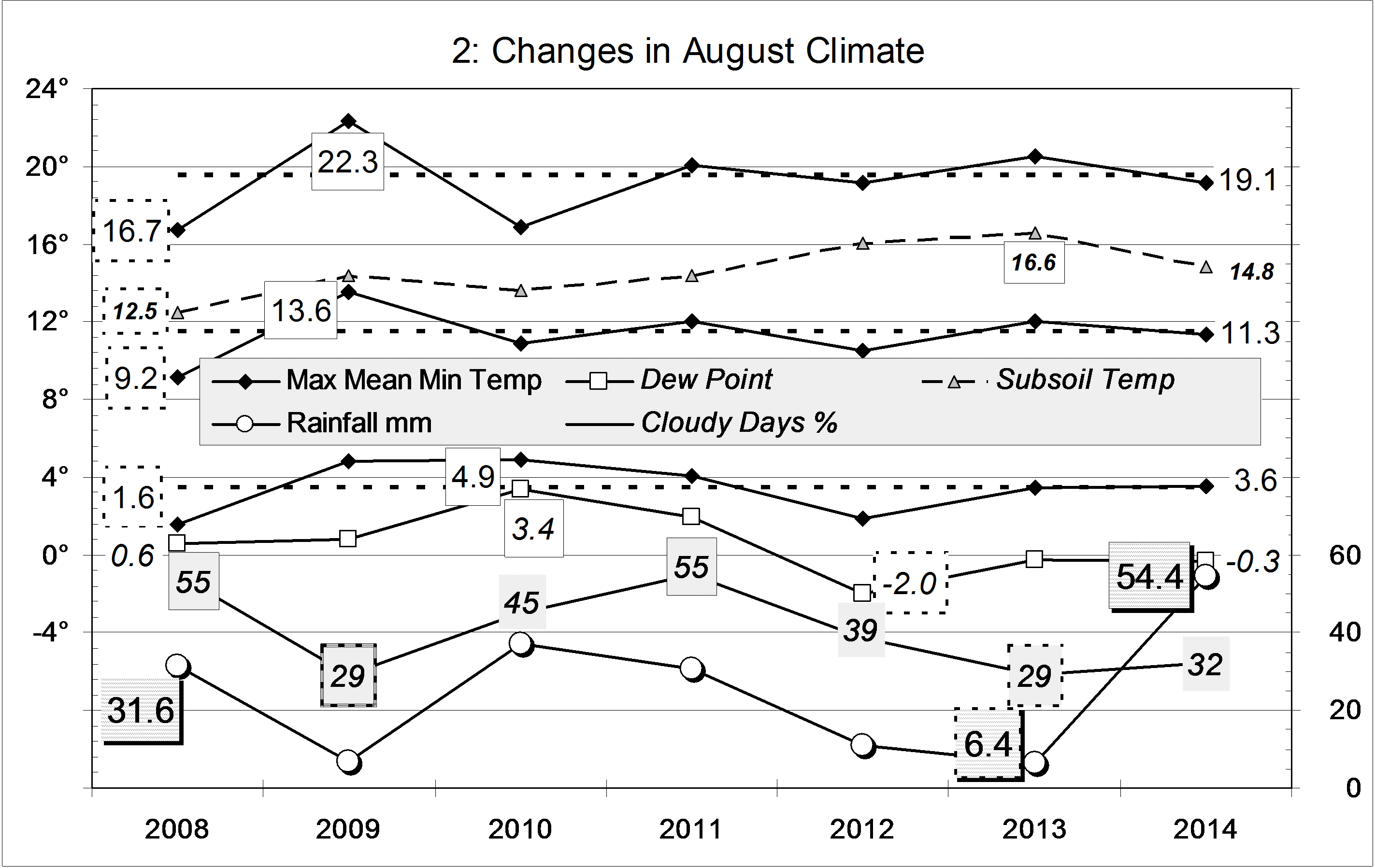 14Augclimate Published September 1, 2014 at 2846 × 1797 in August 2014 normal but with dry air « Previous Graphical log of the last seven August months at Manilla, NSW, showing mean values of maximum, minimum and mean temperature, soil temperature, early morning dew point and cloudy days percent, and total monthly rainfall in millimetres.
