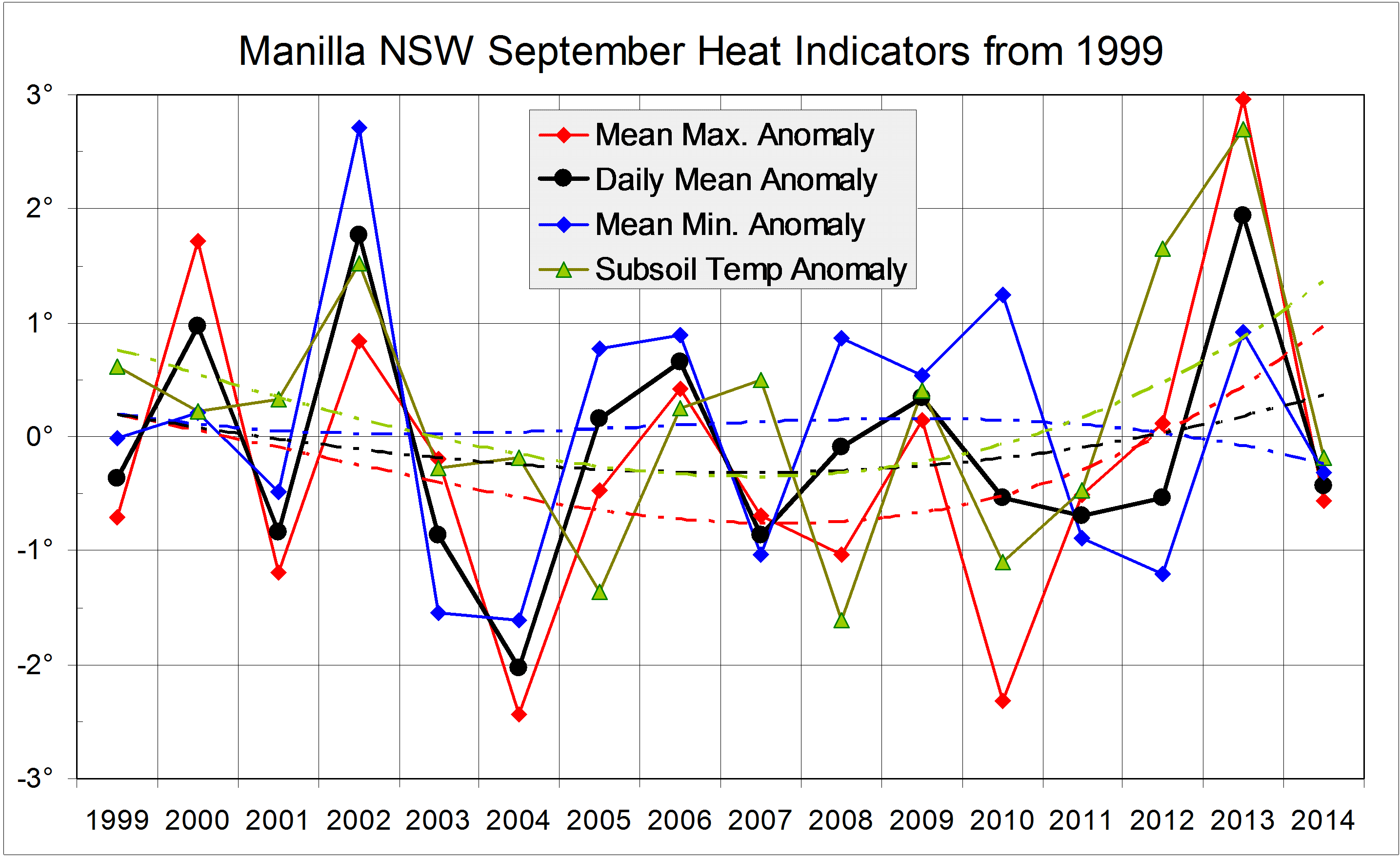September Heat Published October 1, 2014 at 2870 × 1758 in September Climate Anomalies Log « Previous Graphical log of the climate variable anomalies that are grouped as Heat Indicators for Septembermonths 1999 to 2014. Data for Manilla NSW. Quartic trend lines added.