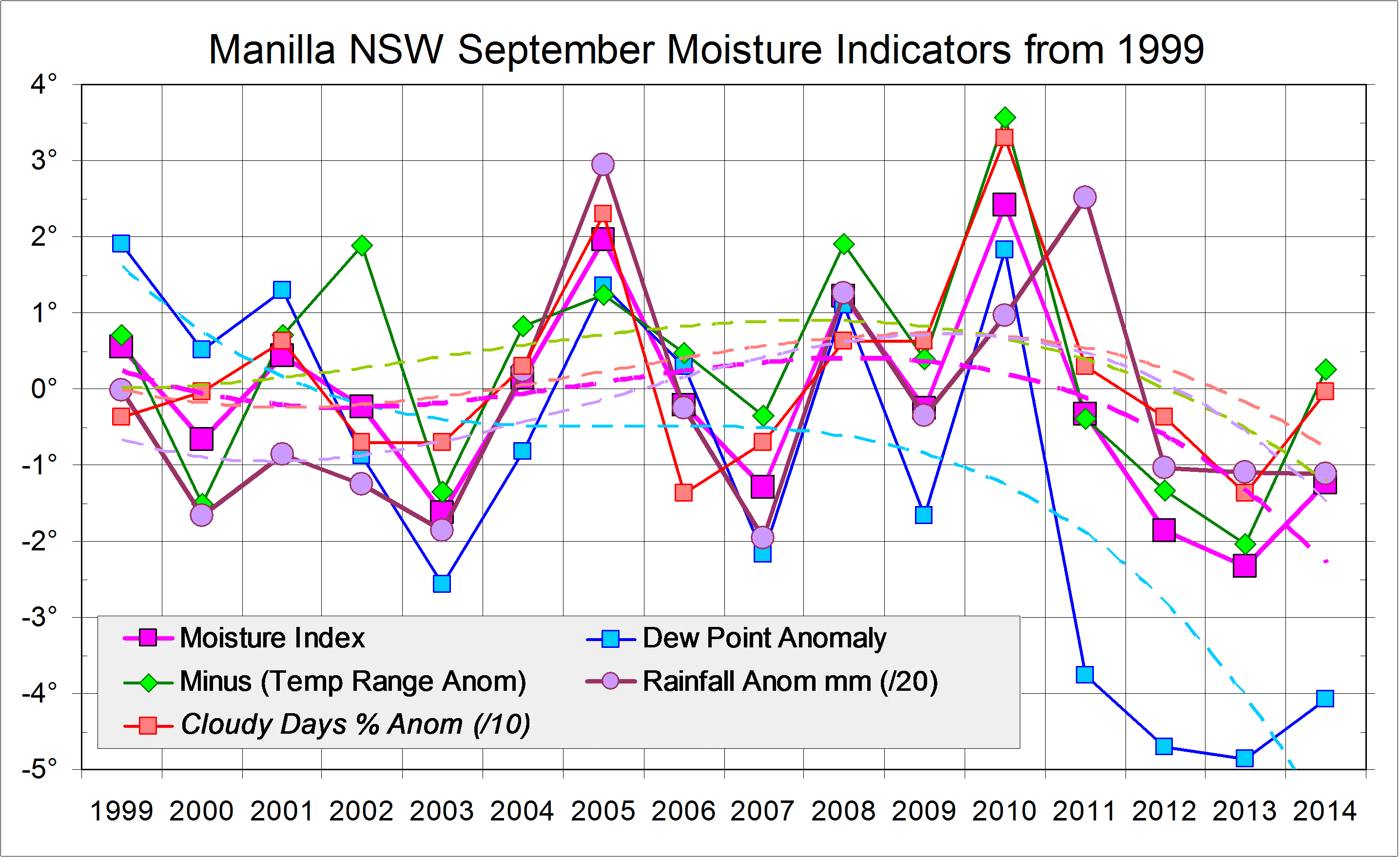 September Heat Published October 1, 2014 at 2872 × 1760 in September Climate Anomalies Log Next » Graphical log of the climate variable anomalies that are grouped as Moisture Indicators for September months 1999 to 2014. Data for Manilla NSW. Quartic trend lines added.