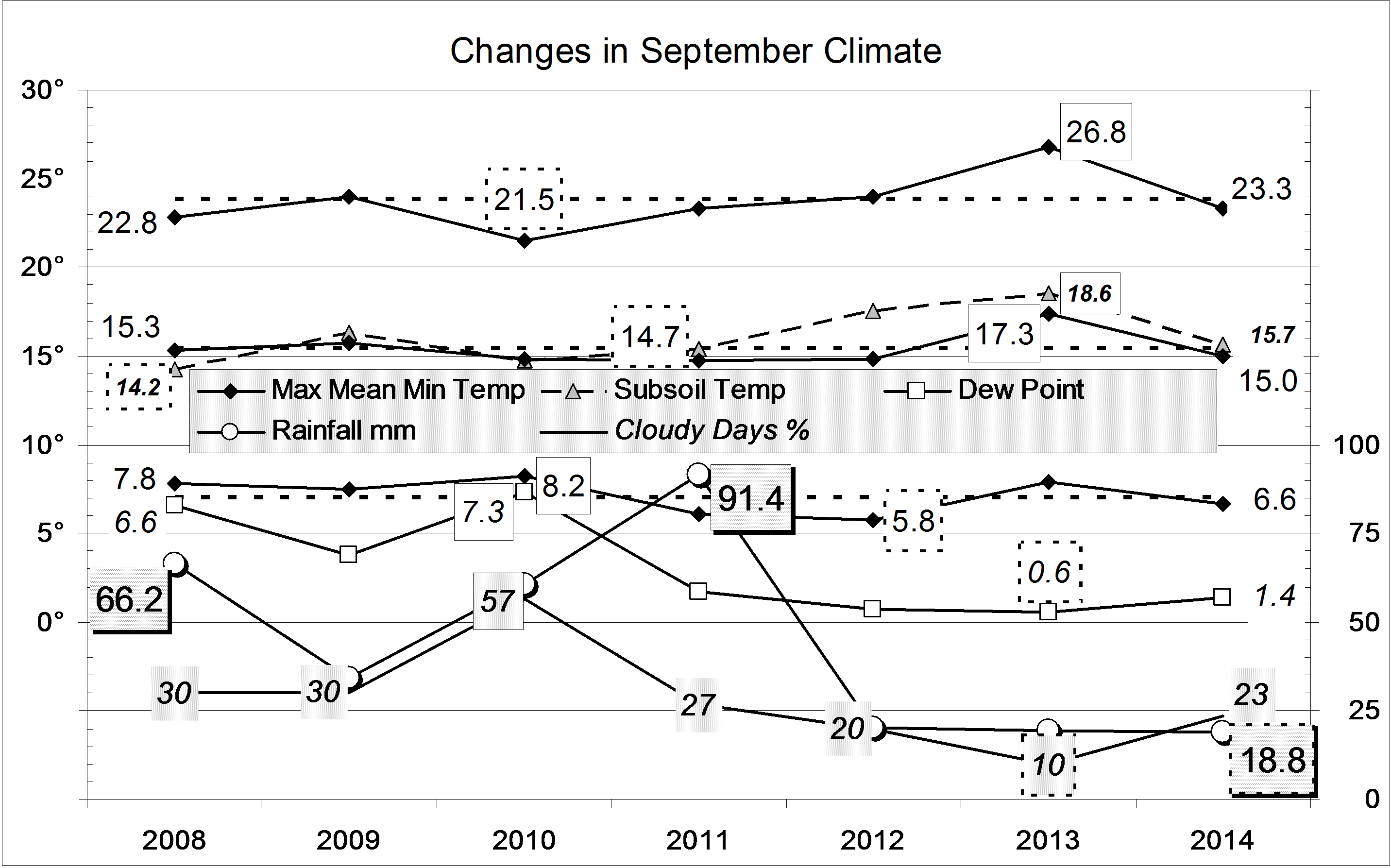 14Sepclimate Published October 6, 2014 at 2864 × 1787 in September 2014 cool and dry « Previous Graphical log of the last seven September months at Manilla, NSW, showing mean values of maximum, minimum and mean temperature, soil temperature, early morning dew point and cloudy days percent, and total monthly rainfall in millimetres.