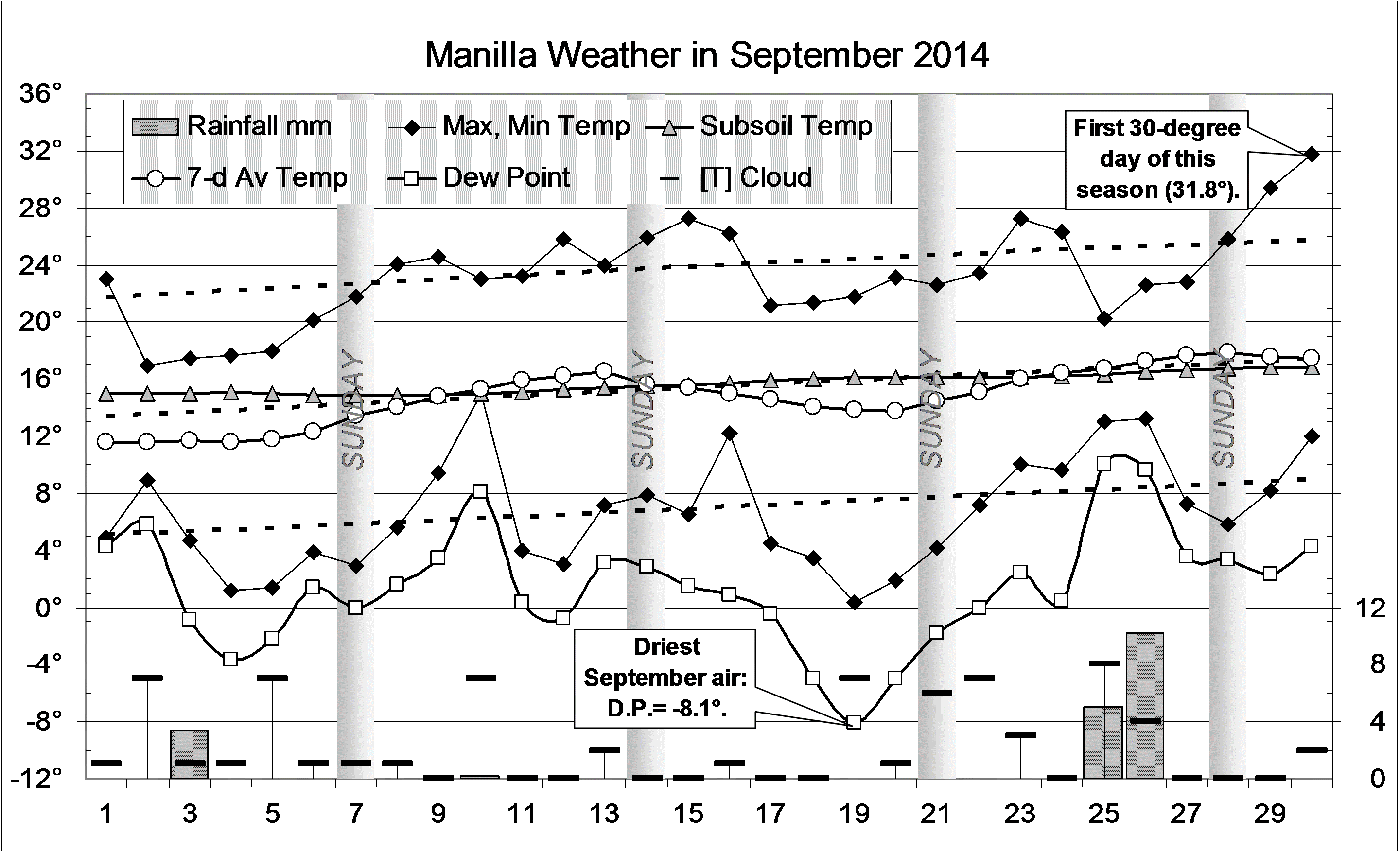 14Sepweather Published October 6, 2014 at 2880 × 1755 in September 2014 cool and dry « Previous Next » Graphical log, for September 2014, of daily values of maximum and minimum temperatures, subsoil (750mm) temperature and early morning dew point (all in degrees Celsius), rainfall (mm) and cloud amount (octas). Weekly mean temperature also shown.