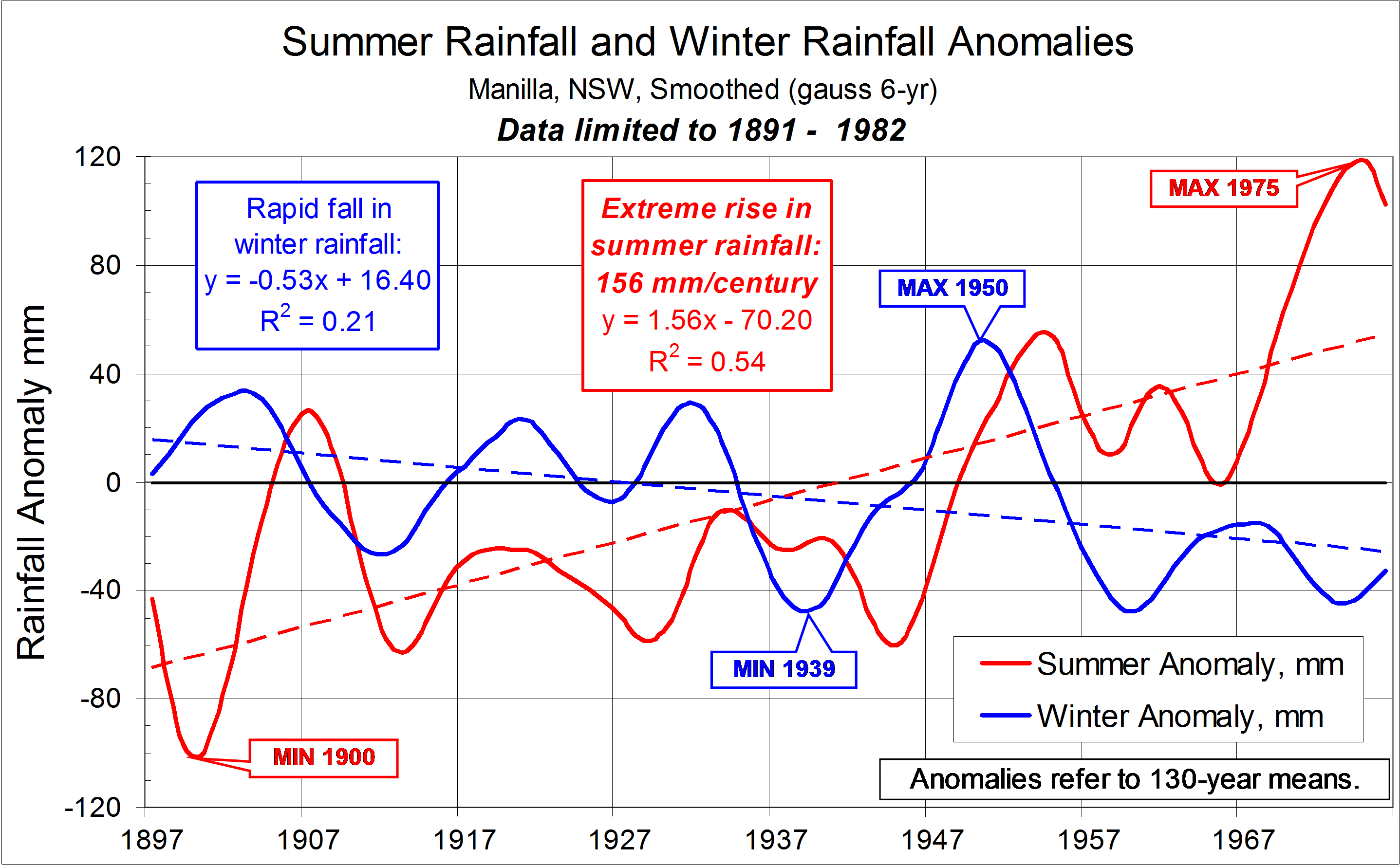 Published October 16, 2014 at 2875 × 1779 in Decadal and Inter-decadal changes in rainfall: II. Next » Restricted 92-year log of smoothed summer and winter rainfall anomalies at Manilla, NSW.