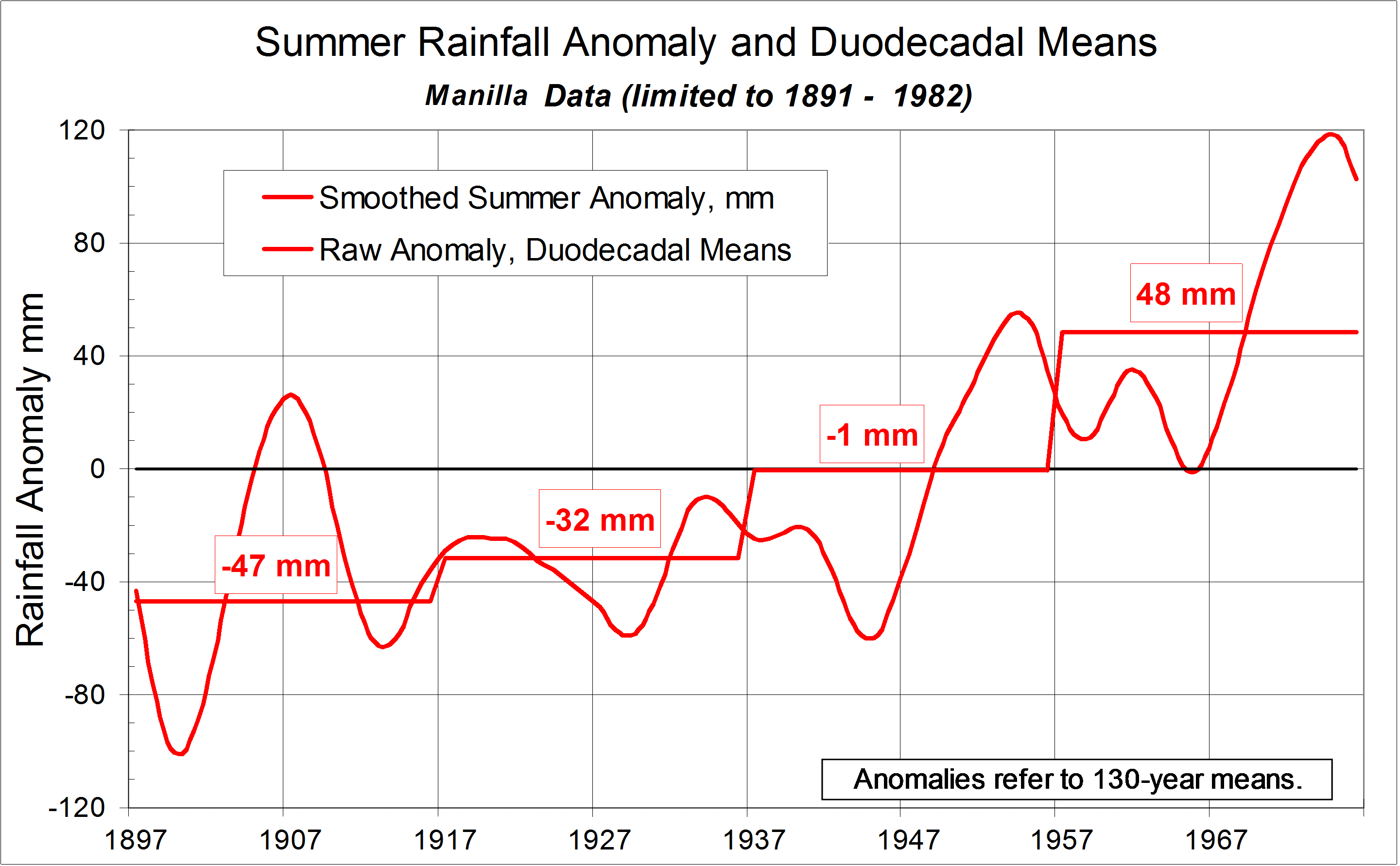 Published October 22, 2014 at 2881 × 1782 in Decadal and Inter-decadal changes in rainfall: III. « Previous Restricted 92-year log of smoothed summer rainfall anomaly and duodecadal means at Manilla, NSW.