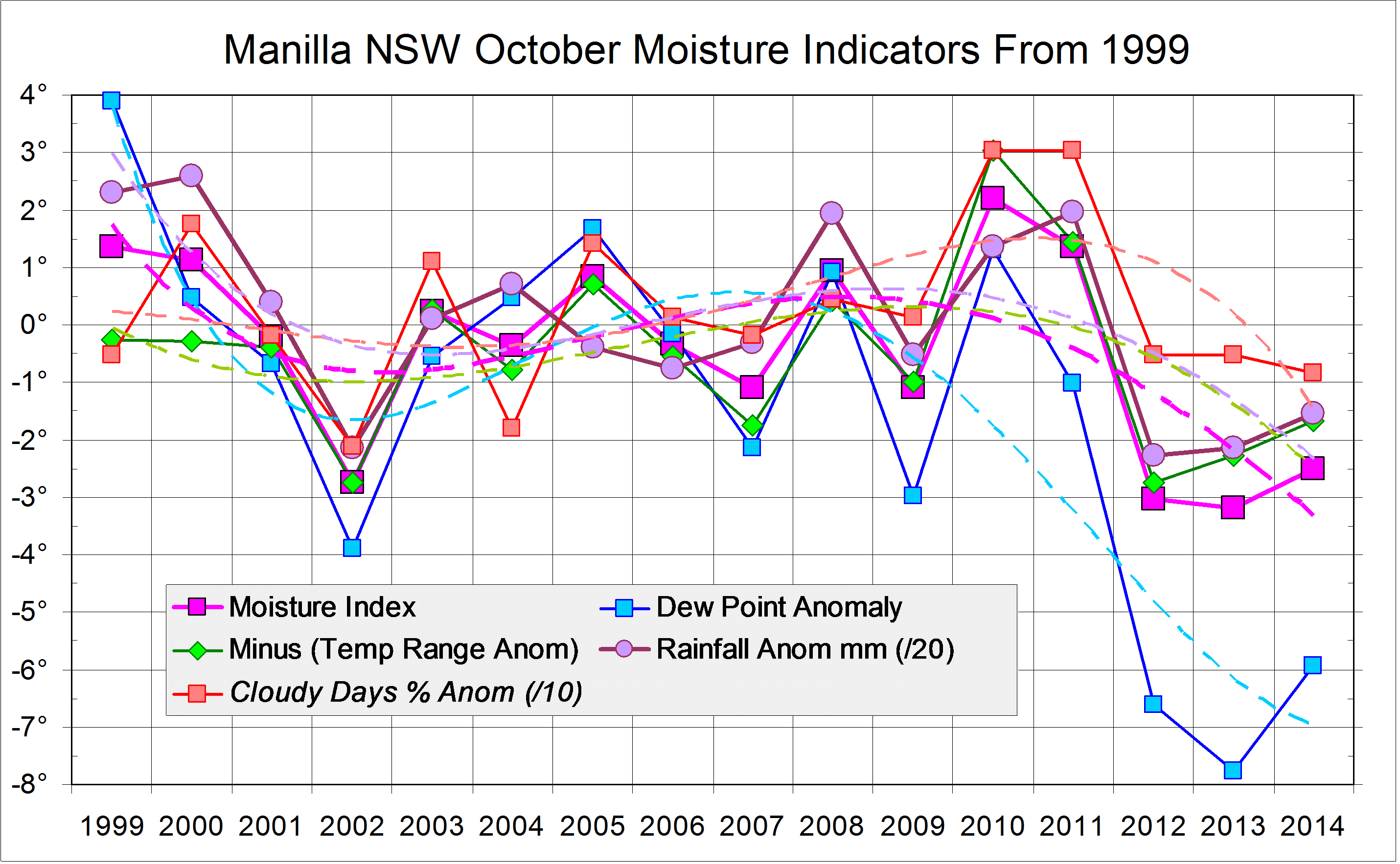 Published October 31, 2014 at 2861 × 1767 in October Climate Anomalies Log « Previous Graphical log of the climate variable anomalies that are grouped as Moisture Indicators for October months 1999 to 2014. Data for Manilla NSW. Quartic trend lines added.