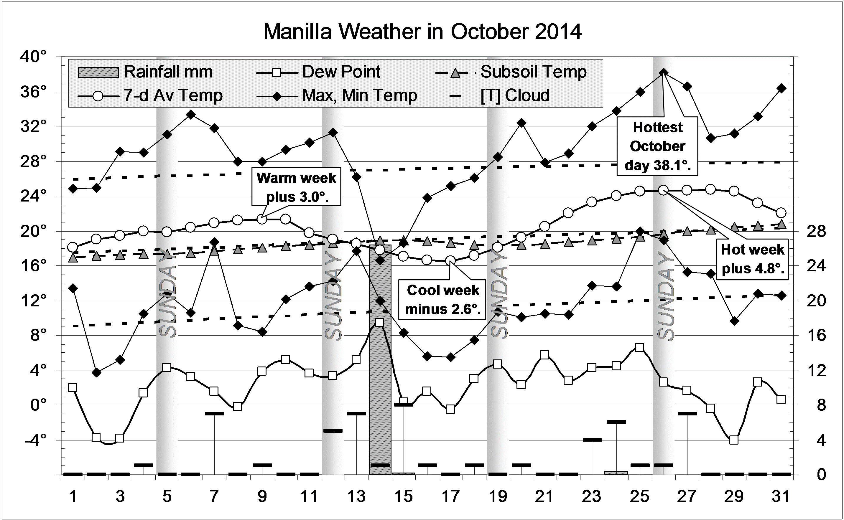 Published November 3, 2014 at 2863 × 1765 in October 2014 hot and dry Next » Graphical log, for October 2014, of daily values of maximum and minimum temperatures, subsoil (750mm) temperature and early morning dew point (all in degrees Celsius), rainfall (mm) and cloud amount (octas). Weekly mean temperature also shown.