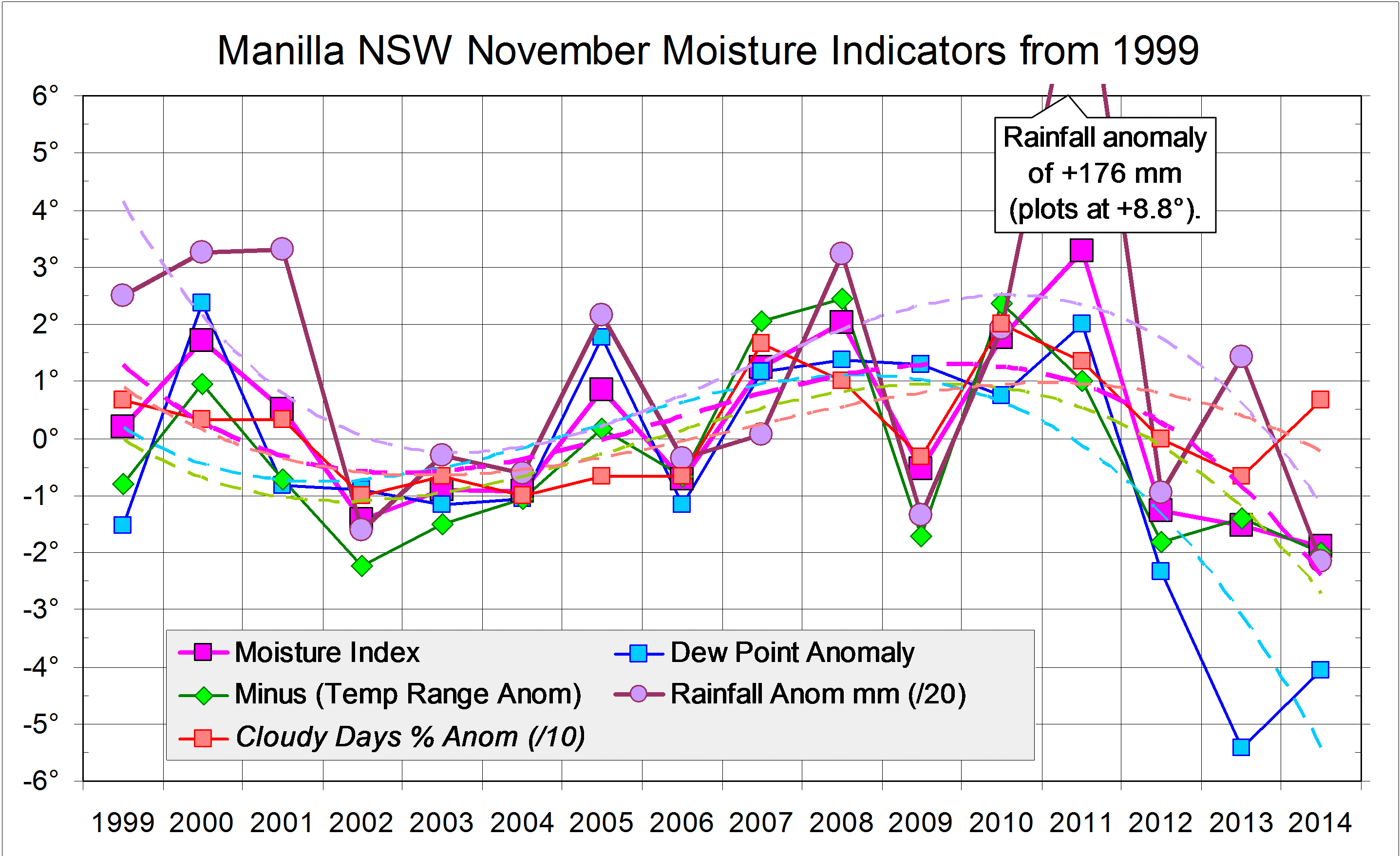 Published November 30, 2014 at 2874 × 1756 in November Climate Anomalies Log « Previous Graphical log of the climate variable anomalies that are grouped as Moisture Indicators for November months 1999 to 2014. Data for Manilla NSW. Quartic trend lines added.