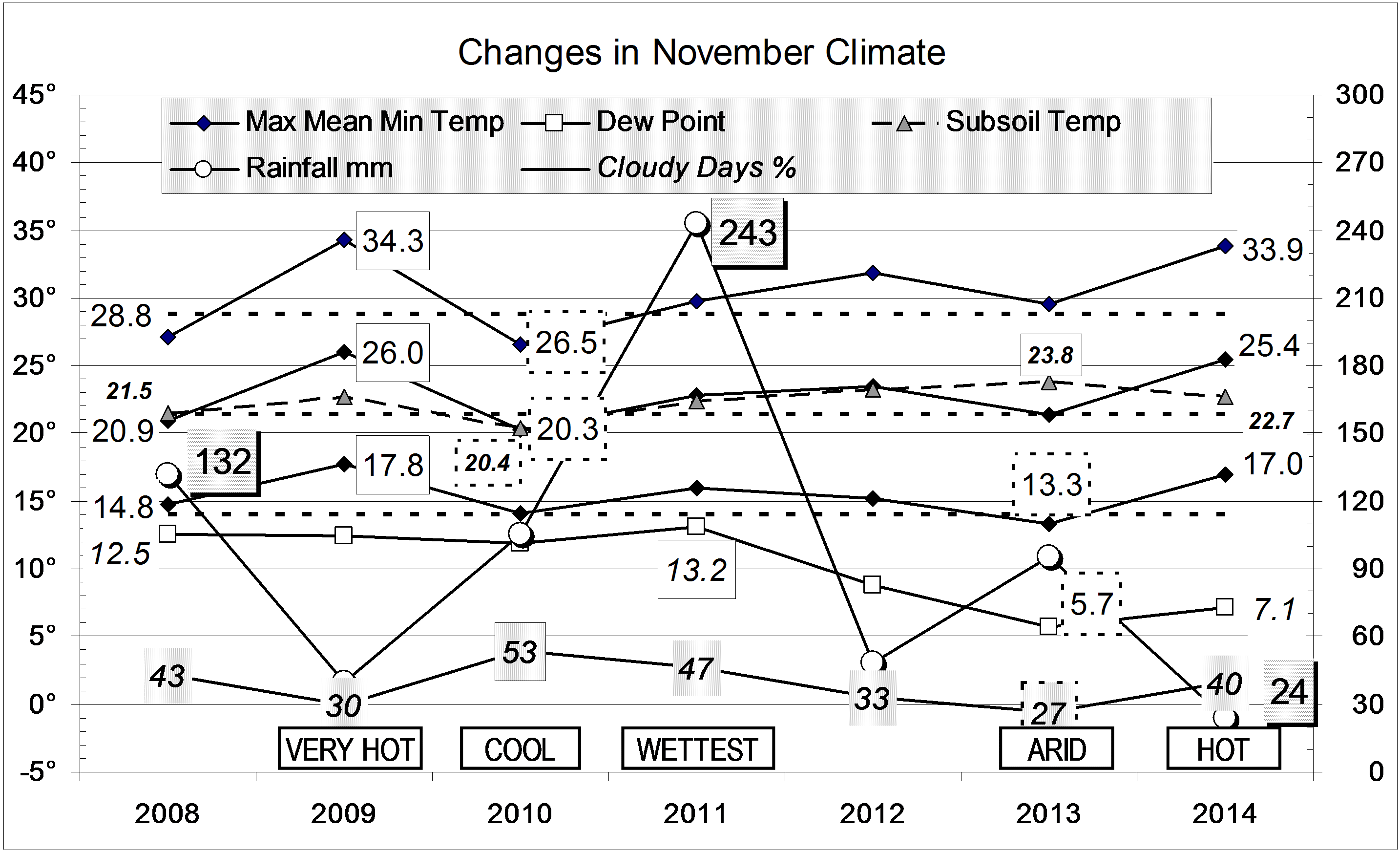 Published December 1, 2014 at 2867 × 1746 in Still hot and dry in November 2014 « Previous Graphical log of the last seven November months at Manilla, NSW, showing mean values of maximum, minimum and mean temperature, soil temperature, early morning dew point and cloudy days percent, and total monthly rainfall in millimetres.
