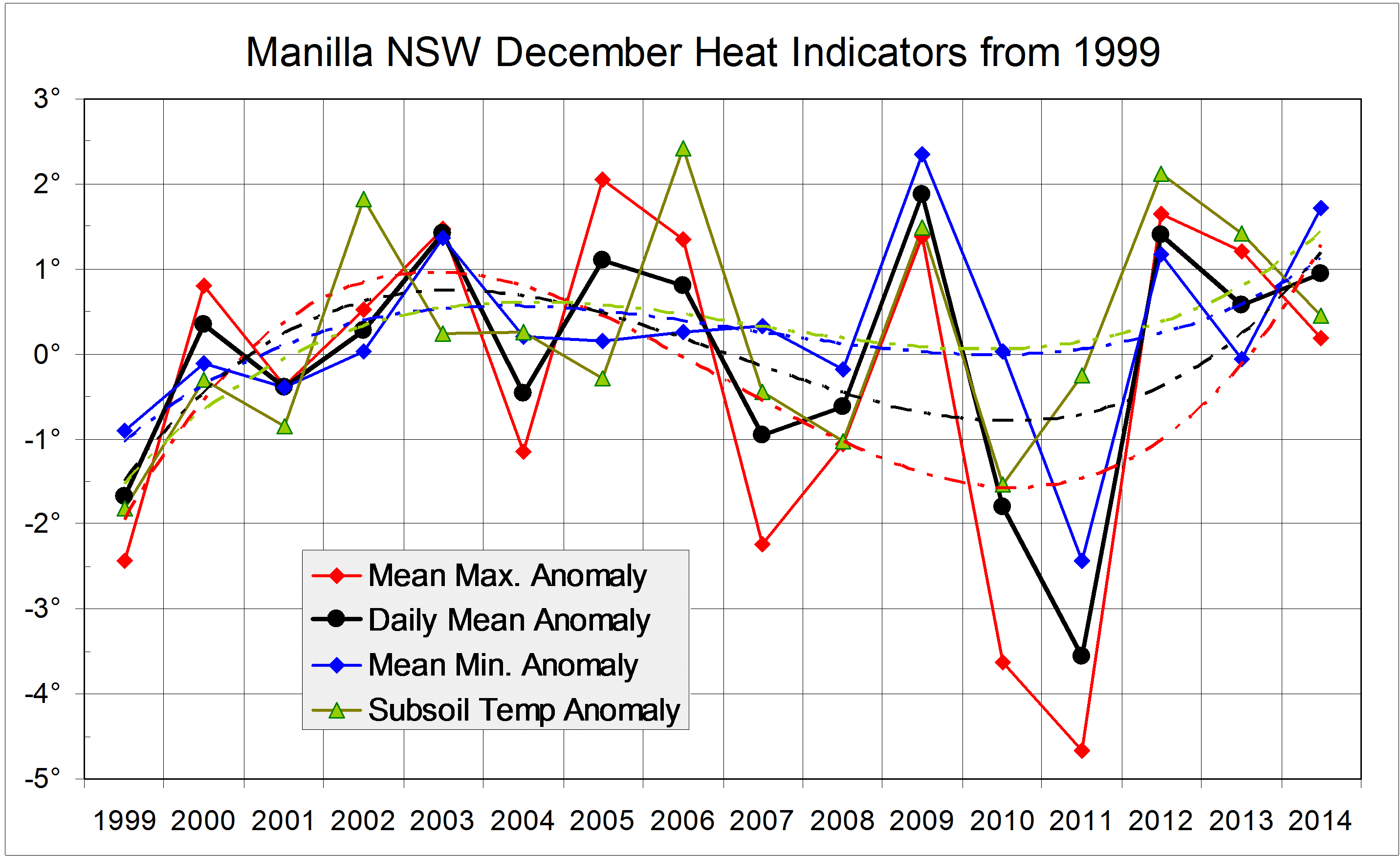 Published December 31, 2014 at 2864 × 1756 in December Climate Anomalies Log Next » Graphical log of the climate variable anomalies that are grouped as Heat Indicators for December months 1999 to 2014. Data for Manilla NSW. Quartic trend lines added.