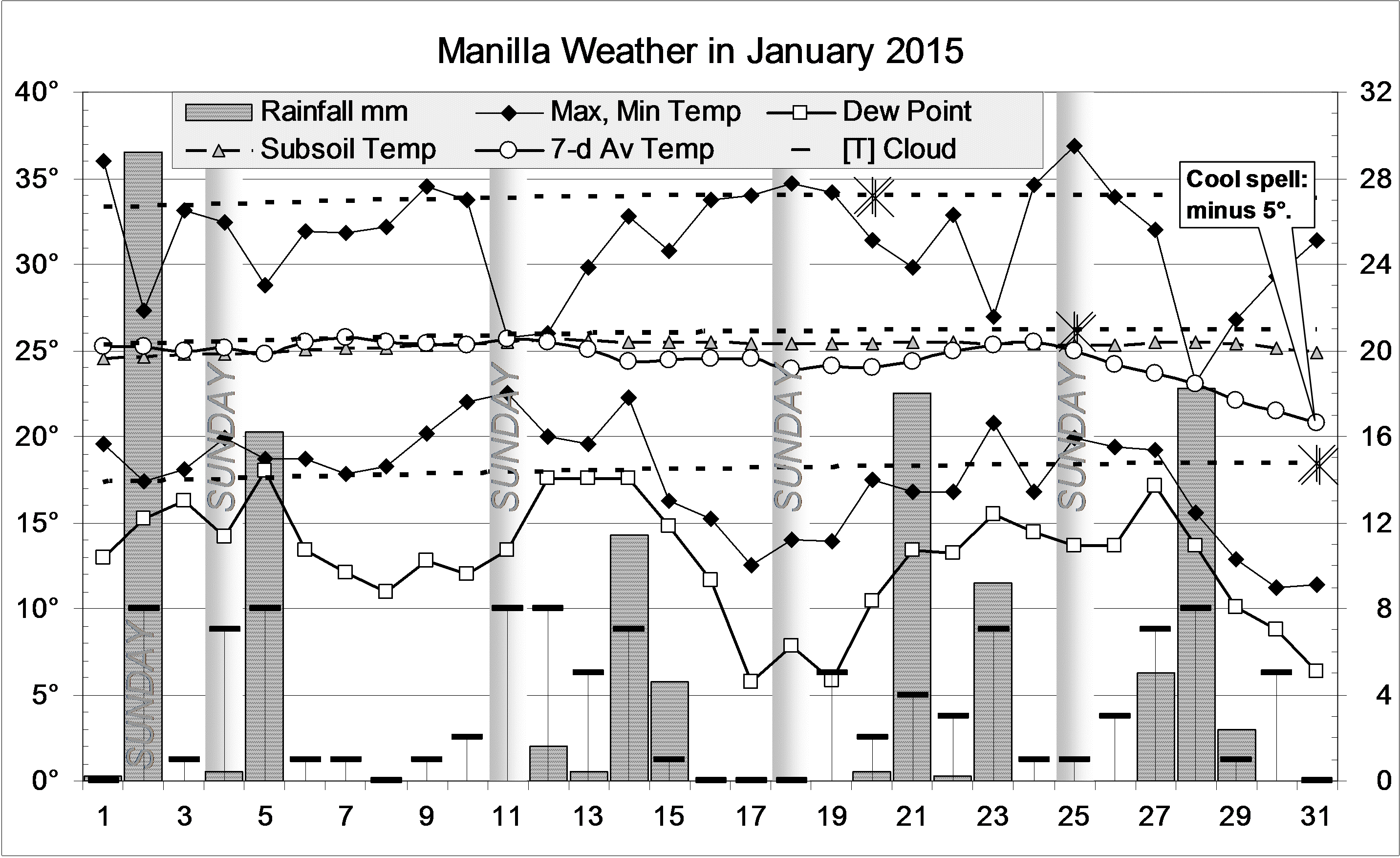 Published February 2, 2015 at 2865 × 1755 in January 2015: cool rainy days « Previous Next » Graphical log, for January 2015, of daily values of maximum and minimum temperatures, subsoil (750mm) temperature and early morning dew point (all in degrees Celsius), rainfall (mm) and cloud amount (octas). Weekly mean temperature also shown.