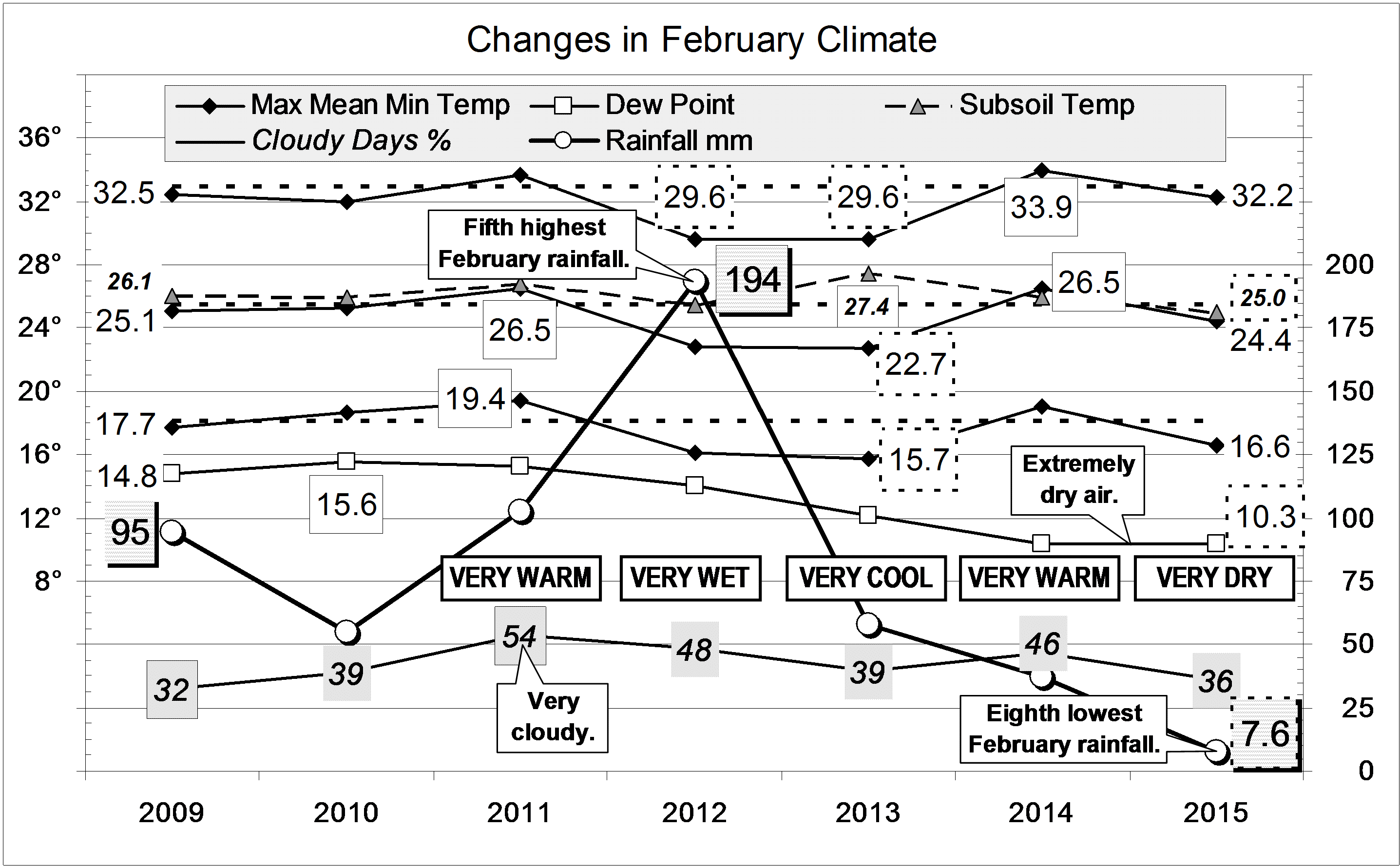 Published March 2, 2015 at 2873 × 1779 in February 2015 a very dry month « Previous Graphical log of the last seven February months at Manilla, NSW, showing mean values of maximum, minimum and mean temperature, soil temperature, early morning dew point and cloudy days percent, and total monthly rainfall in millimetres.